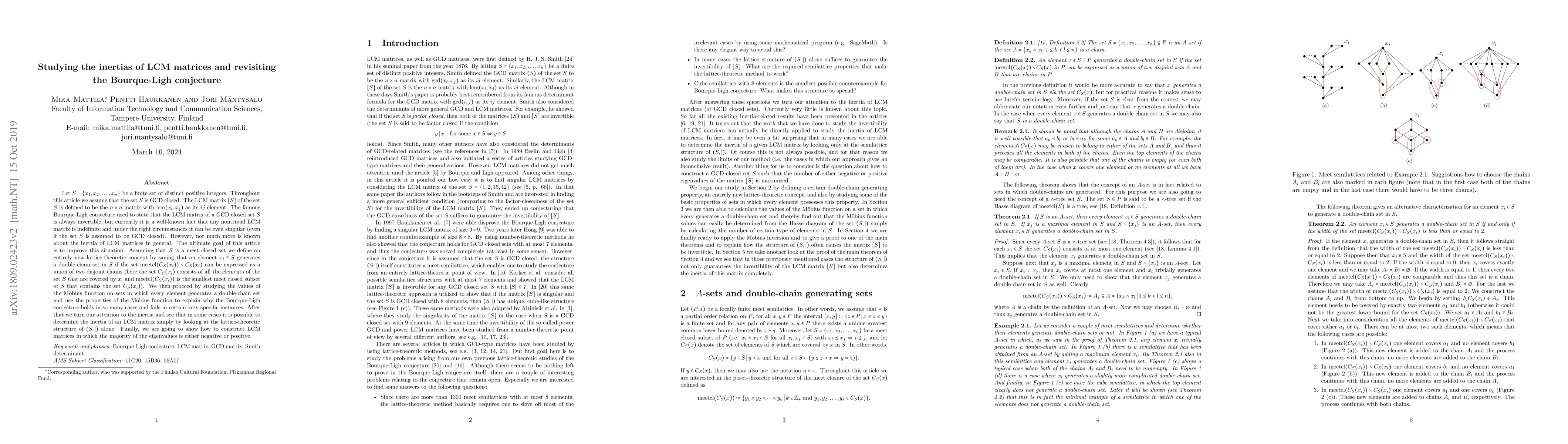 Let $S=\{x_1,x_2,\ldots,x_n\}$ be a finite set of distinct positive integers. Throughout this article we assume that the set $S$ is GCD closed. The LCM matrix $[S]$ of the set $S$ is defined to be the $n\times n$ matrix with $\mathrm{lcm}(x_i,x_j)$ as its $ij$ element. The famous Bourque-Ligh conjecture used to state that the LCM matrix of a GCD closed set $S$ is always invertible, but currently it is a well-known fact that any nontrivial LCM matrix is indefinite and under the right circumstances it can be even singular (even if the set $S$ is assumed to be GCD closed). However, not much more is known about the inertia of LCM matrices in general. The ultimate goal of this article is to improve this situation. Assuming that $S$ is a meet closed set we define an entirely new lattice-theoretic concept by saying that an element $x_i\in S$ generates a double-chain set in $S$ if the set $\mathrm{meetcl}(C_S(x_i))\setminus C_S(x_i)$ can be expressed as a union of two disjoint chains (here the set $C_S(x_i)$ consists of all the elements of the set $S$ that are covered by $x_i$ and $\mathrm{meetcl}(C_S(x_i))$ is the smallest meet closed subset of $S$ that contains the set $C_S(x_i)$). We then proceed by studying the values of the M\"obius function on sets in which every element generates a double-chain set and use the properties of the M\"obius function to explain why the Bourque-Ligh conjecture holds in so many cases and fails in certain very specific instances. After that we turn our attention to the inertia and see that in some cases it is possible to determine the inertia of an LCM matrix simply by looking at the lattice-theoretic structure of $(S,|)$ alone. Finally, we are going to show how to construct LCM matrices in which the majority of the eigenvalues is either negative or positive.