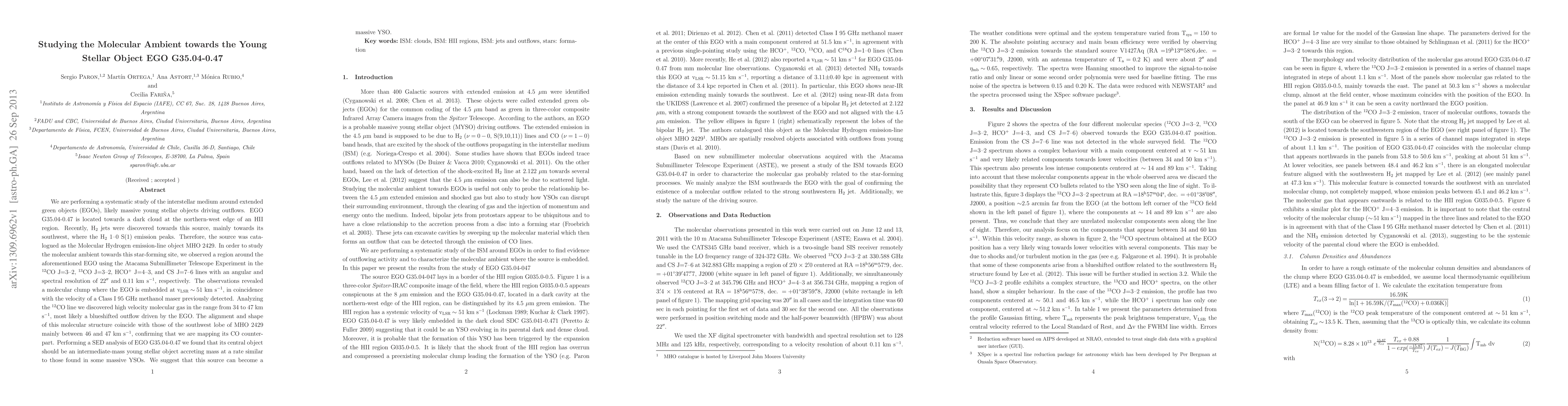 We are performing a systematic study of the interstellar medium around extended green objects (EGOs), likely massive young stellar objects driving outflows. EGO G35.04-0.47 is located towards a dark cloud at the northern-west edge of an HII region. Recently, H2 jets were discovered towards this source, mainly towards its southwest, where the H2 1-0 S(1) emission peaks. Therefore, the source was catalogued as the Molecular Hydrogen emission-line object MHO 2429. In order to study the molecular ambient towards this star-forming site, we observed a region around the aforementioned EGO using the Atacama Submillimeter Telescope Experiment in the 12CO J=3--2, 13CO J=3--2, HCO+ J=4--3, and CS J=7--6 lines with an angular and spectral resolution of 22" and 0.11 km s-1, respectively. The observations revealed a molecular clump where the EGO is embedded at v_LSR ~ 51 km s-1, in coincidence with the velocity of a Class I 95 GHz methanol maser previously detected. Analyzing the 12CO line we discovered high velocity molecular gas in the range from 34 to 47 km s-1, most likely a blueshifted outflow driven by the EGO. The alignment and shape of this molecular structure coincide with those of the southwest lobe of MHO 2429 mainly between 46 and 47 km s-1, confirming that we are mapping its CO counterpart. Performing a SED analysis of EGO G35.04-0.47 we found that its central object should be an intermediate-mass young stellar object accreting mass at a rate similar to those found in some massive YSOs. We suggest that this source can become a massive YSO.