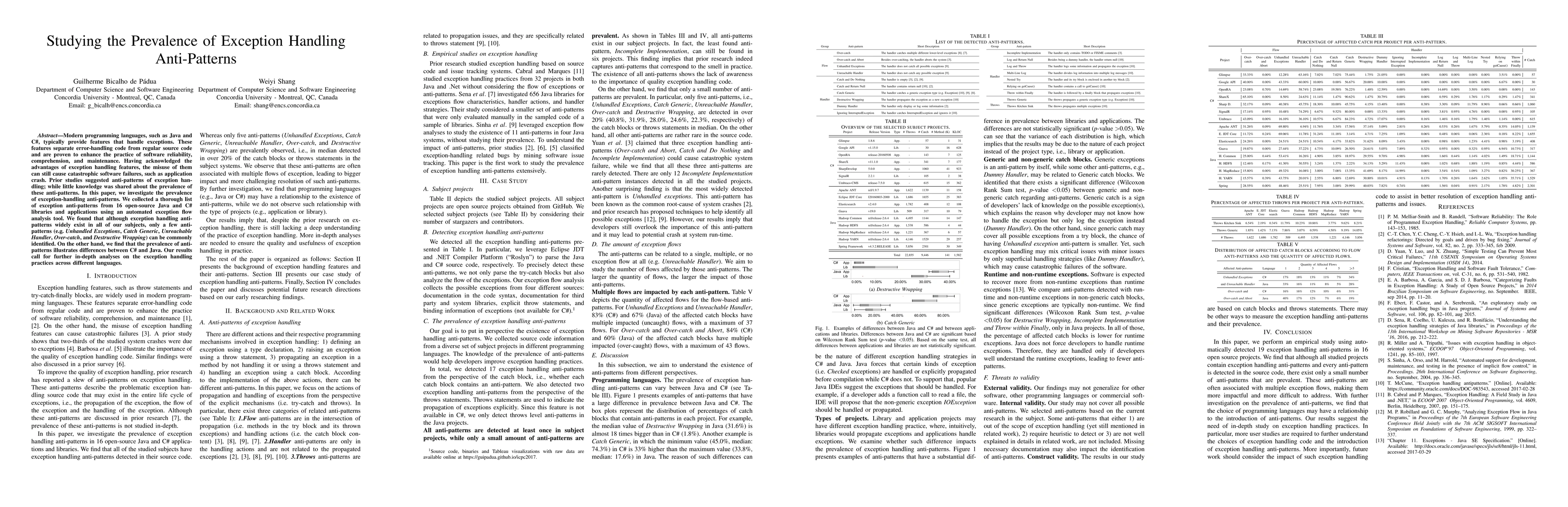 This paper investigates the prevalence of exception-handling anti-patterns in Java and C# open-source projects using automated analysis. It identifies common anti-patterns like Unhandled Exceptions and Over-catch, revealing differences in their occurrence between C# and Java, and calls for deeper analyses of exception handling practices across programming languages.
