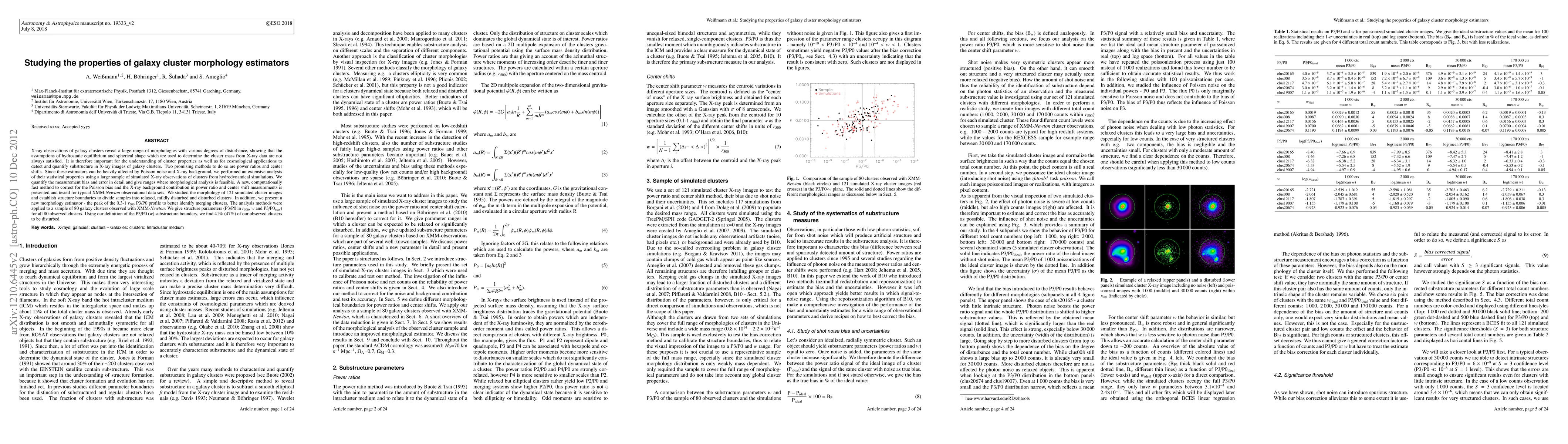 X-ray observations of galaxy clusters reveal a large range of morphologies with various degrees of disturbance, showing that the assumptions of hydrostatic equilibrium and spherical shape which are used to determine the cluster mass from X-ray data are not always satisfied. It is therefore important for the understanding of cluster properties as well as for cosmological applications to detect and quantify substructure in X-ray images of galaxy clusters. Two promising methods to do so are power ratios and center shifts. Since these estimators can be heavily affected by Poisson noise and X-ray background, we performed an extensive analysis of their statistical properties using a large sample of simulated X-ray observations of clusters from hydrodynamical simulations. We quantify the measurement bias and error in detail and give ranges where morphological analysis is feasible. A new, computationally fast method to correct for the Poisson bias and the X-ray background contribution in power ratio and center shift measurements is presented and tested for typical XMM-Newton observational data sets. We studied the morphology of 121 simulated cluster images and establish structure boundaries to divide samples into relaxed, mildly disturbed and disturbed clusters. In addition, we present a new morphology estimator - the peak of the 0.3-1 r500 P3/P0 profile to better identify merging clusters. The analysis methods were applied to a sample of 80 galaxy clusters observed with XMM-Newton. We give structure parameters (P3/P0 in r500, w and P3/P0_max) for all 80 observed clusters. Using our definition of the P3/P0 (w) substructure boundary, we find 41% (47%) of our observed clusters to be disturbed.