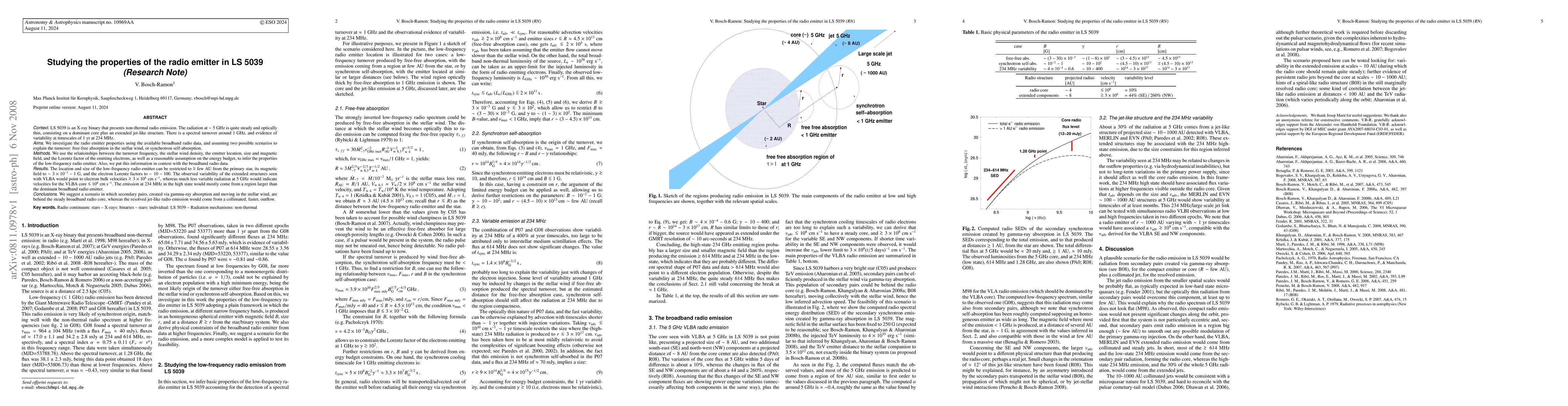 LS 5039 is an X-ray binary that presents non-thermal radio emission. The radiation at $\sim 5$ GHz is quite steady and optically thin, consisting on a dominant core plus an extended jet-like structure. There is a spectral turnover around 1 GHz, and evidence of variability at timescales of 1 yr at 234 MHz. We investigate the radio emitter properties using the available broadband radio data, and assuming two possible scenarios to explain the turnover: free-free absorption in the stellar wind, or synchrotron self-absorption. We use the relationships between the turnover frequency, the stellar wind density, the emitter location, size and magnetic field, and the Lorentz factor of the emitting electrons, as well as a reasonable assumption on the energy budget, to infer the properties of the low-frequency radio emitter. Also, we put this information in context with the broadband radio data. The location and size of the low-frequency radio emitter can be restricted to $\ga$ few AU from the primary star, its magnetic field to $\sim 3\times 10^{-3}-1$ G, and the electron Lorentz factors to $\sim 10-100$. The observed variability of the extended structures seen with VLBA would point to electron bulk velocities $\ga 3\times 10^8$ cm s$^{-1}$, whereas much less variable radiation at 5 GHz would indicate velocities for the VLBA core $\la 10^8$ cm s$^{-1}$. The emission at 234 MHz in the high state would mostly come from a region larger than the dominant broadband radio emitter. We suggest a scenario in which secondary pairs, created via gamma-ray absorption and moving in the stellar wind, are behind the steady broadband radio core, whereas the resolved jet-like radio emission would come from a collimated, faster, outflow.