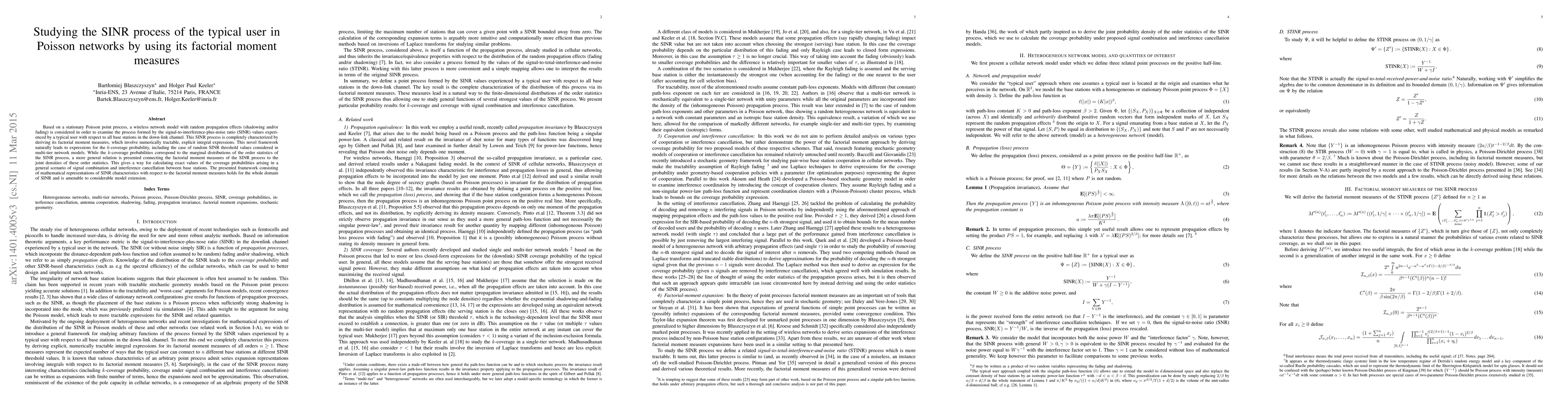 Based on a stationary Poisson point process, a wireless network model with random propagation effects (shadowing and/or fading) is considered in order to examine the process formed by the signal-to-interference-plus-noise ratio (SINR) values experienced by a typical user with respect to all base stations in the down-link channel. This SINR process is completely characterized by deriving its factorial moment measures, which involve numerically tractable, explicit integral expressions. This novel framework naturally leads to expressions for the k-coverage probability, including the case of random SINR threshold values considered in multi-tier network models. While the k-coverage probabilities correspond to the marginal distributions of the order statistics of the SINR process, a more general relation is presented connecting the factorial moment measures of the SINR process to the joint densities of these order statistics. This gives a way for calculating exact values of the coverage probabilities arising in a general scenario of signal combination and interference cancellation between base stations. The presented framework consisting of mathematical representations of SINR characteristics with respect to the factorial moment measures holds for the whole domain of SINR and is amenable to considerable model extension.