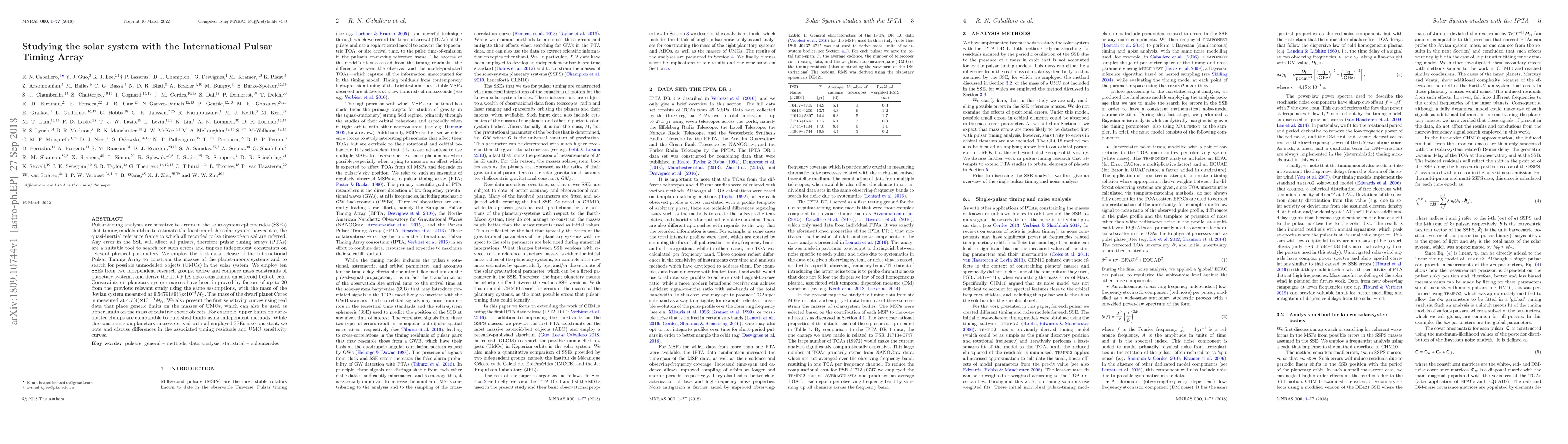 Pulsar-timing analyses are sensitive to errors in the solar-system ephemerides (SSEs) that timing models utilise to estimate the location of the solar-system barycentre, the quasi-inertial reference frame to which all recorded pulse times-of-arrival are referred. Any error in the SSE will affect all pulsars, therefore pulsar timing arrays (PTAs) are a suitable tool to search for such errors and impose independent constraints on relevant physical parameters. We employ the first data release of the International Pulsar Timing Array to constrain the masses of the planet-moons systems and to search for possible unmodelled objects (UMOs) in the solar system. We employ ten SSEs from two independent research groups, derive and compare mass constraints of planetary systems, and derive the first PTA mass constraints on asteroid-belt objects. Constraints on planetary-system masses have been improved by factors of up to 20 from the previous relevant study using the same assumptions, with the mass of the Jovian system measured at 9.5479189(3)$\times10^{-4}$ $M_{\odot}$. The mass of the dwarf planet Ceres is measured at 4.7(4)$\times10^{-10}$ $M_{\odot}$. We also present the first sensitivity curves using real data that place generic limits on the masses of UMOs, which can also be used as upper limits on the mass of putative exotic objects. For example, upper limits on dark-matter clumps are comparable to published limits using independent methods. While the constraints on planetary masses derived with all employed SSEs are consistent, we note and discuss differences in the associated timing residuals and UMO sensitivity curves.