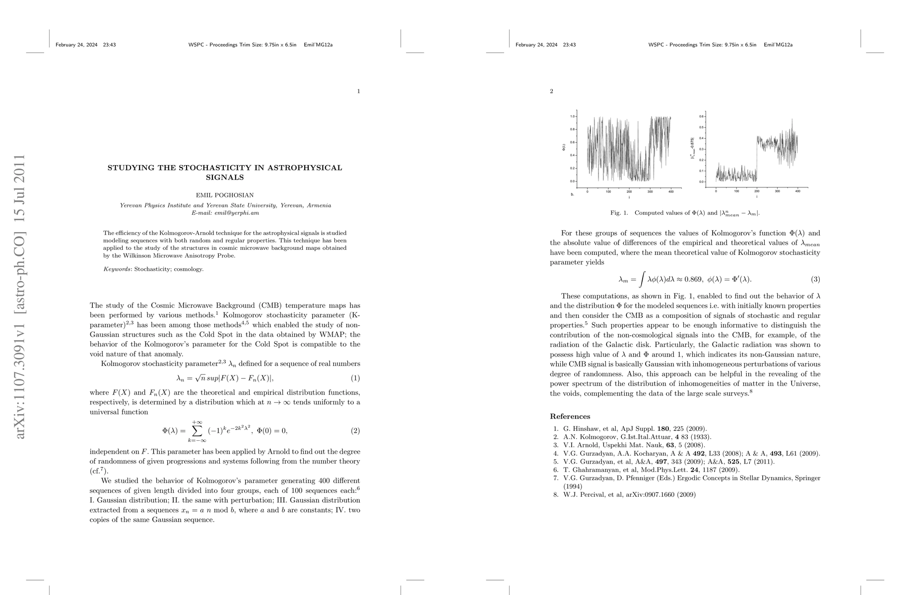 The efficiency of the Kolmogorov-Arnold technique for the astrophysical signals is studied modeling sequences with both random and regular properties. This technique has been applied to the study of the structures in cosmic microwave background maps obtained by the Wilkinson Microwave Anisotropy Probe.