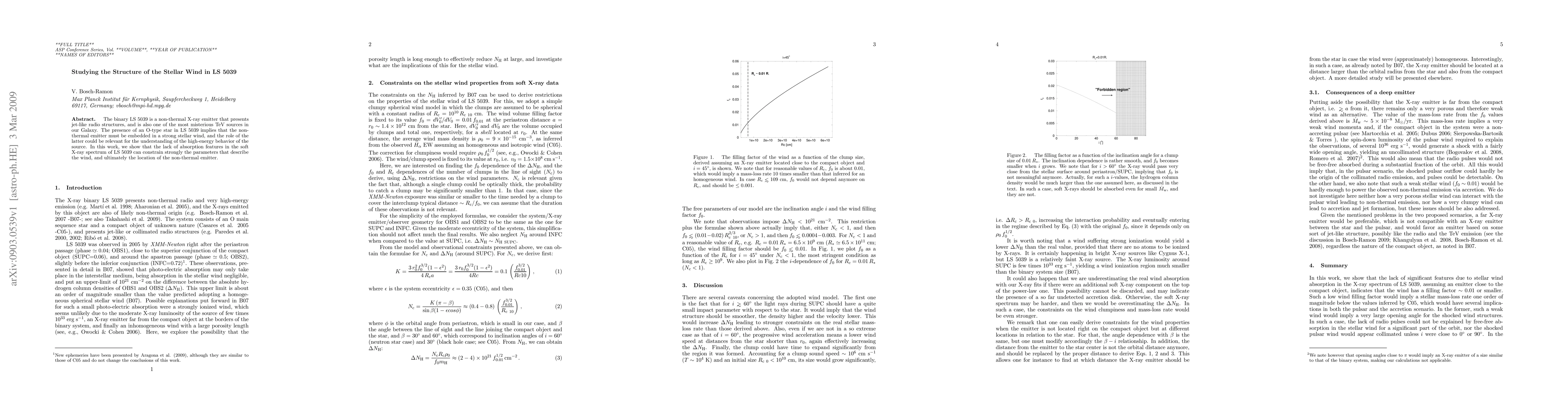 The binary LS 5039 is a non-thermal X-ray emitter that presents jet-like radio structures, and is also one of the most misterious TeV sources in our Galaxy. The presence of an O-type star in LS 5039 implies that the non-thermal emitter must be embedded in a strong stellar wind, and the role of the latter could be relevant for the understanding of the high-energy behavior of the source. In this work, we show that the lack of absorption features in the soft X-ray spectrum of LS 5039 can constrain strongly the parameters that describe the wind, and ultimately the location of the non-thermal emitter.