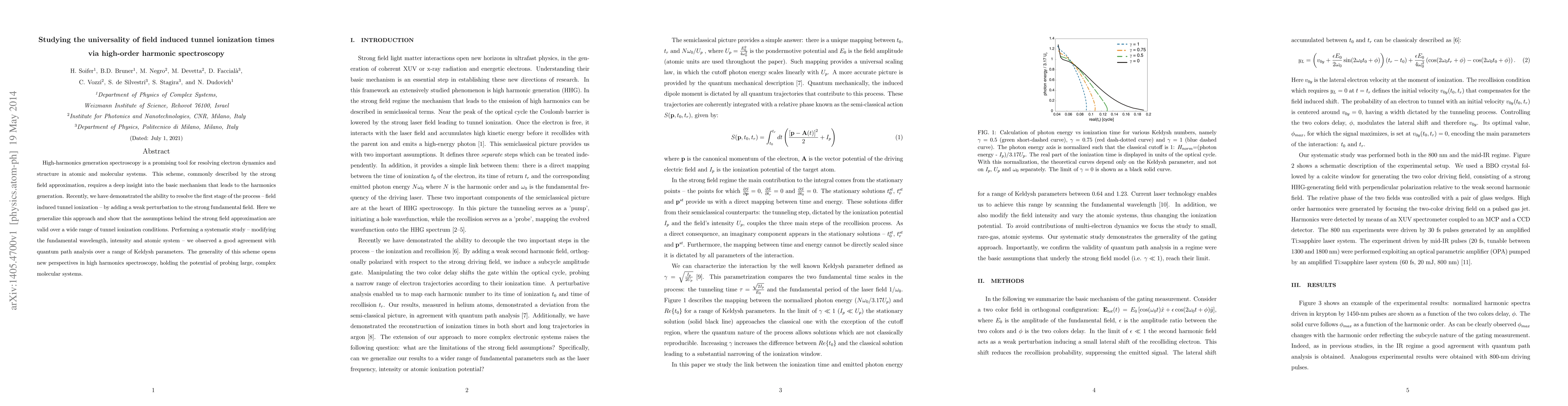 This research uses high-harmonic spectroscopy to study the universality of field-induced tunnel ionization times, demonstrating that the strong field approximation holds across various ionization conditions. The findings suggest this method can probe the dynamics of large, complex molecular systems.