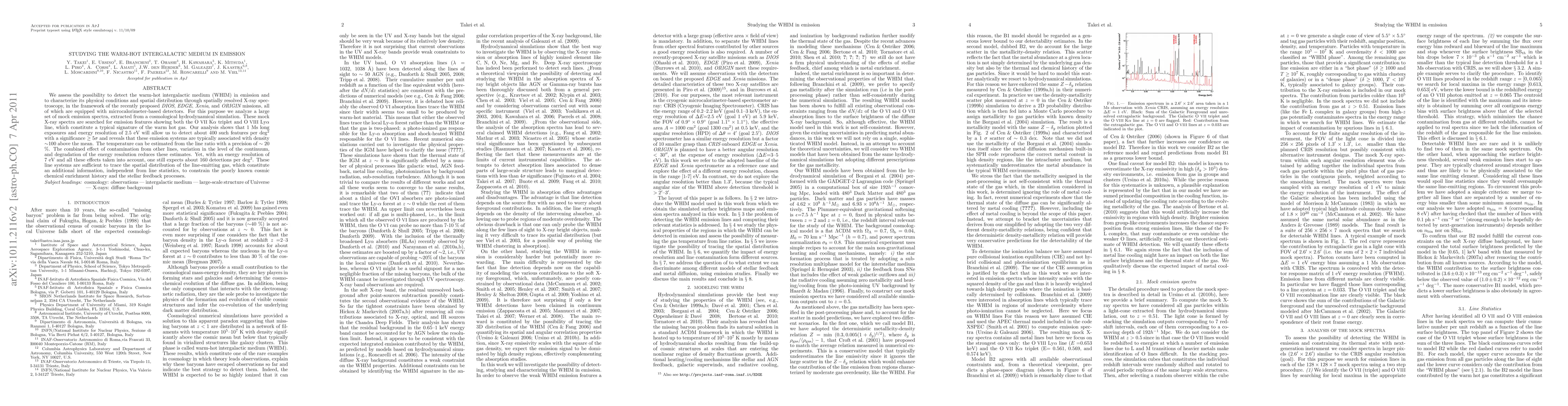 This paper explores the potential to detect the warm-hot intergalactic medium (WHIM) in emission using X-ray spectroscopy from upcoming space missions. The study finds that with 1 Ms exposures and 2.5 eV energy resolution, about 400 emission features per deg^2 can be detected, providing insights into the WHIM's temperature and spatial distribution.