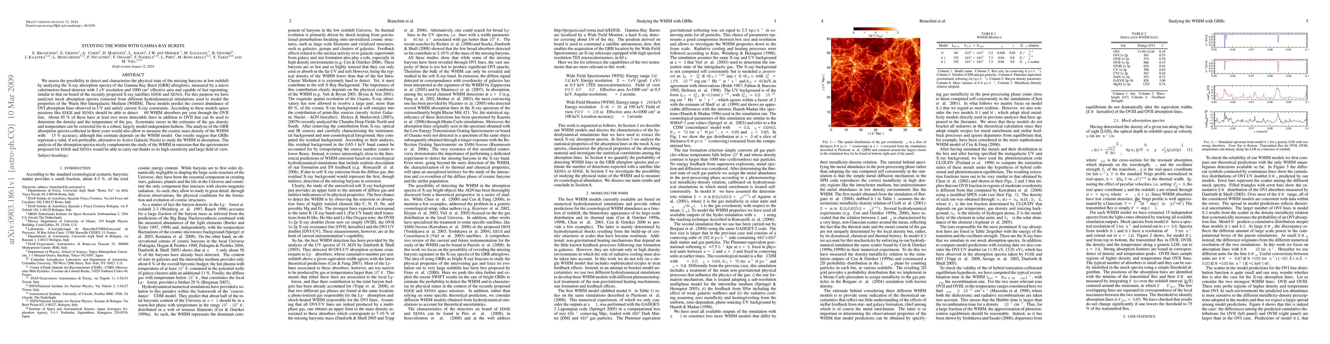 We assess the possibility to detect and characterize the physical state of the missing baryons at low redshift by analyzing the X-ray absorption spectra of the Gamma Ray Burst [GRB] afterglows, measured by a micro calorimeters-based detector with 3 eV resolution and 1000 cm2 effective area and capable of fast re-pointing, similar to that on board of the recently proposed X-ray satellites EDGE and XENIA. For this purpose we have analyzed mock absorption spectra extracted from different hydrodynamical simulations used to model the properties of the Warm Hot Intergalactic Medium [WHIM]. These models predict the correct abundance of OVI absorption lines observed in UV and satisfy current X-ray constraints. According to these models space missions like EDGE and XENIA should be able to detect about 60 WHIM absorbers per year through the OVII line. About 45 % of these have at least two more detectable lines in addition to OVII that can be used to determine the density and the temperature of the gas. Systematic errors in the estimates of the gas density and temperature can be corrected for in a robust, largely model-independent fashion. The analysis of the GRB absorption spectra collected in three years would also allow to measure the cosmic mass density of the WHIM with about 15 % accuracy, although this estimate depends on the WHIM model. Our results suggest that GRBs represent a valid, if not preferable, alternative to Active Galactic Nuclei to study the WHIM in absorption. The analysis of the absorption spectra nicely complements the study of the WHIM in emission that the spectrometer proposed for EDGE and XENIA would be able to carry out thanks to its high sensitivity and large field of view.