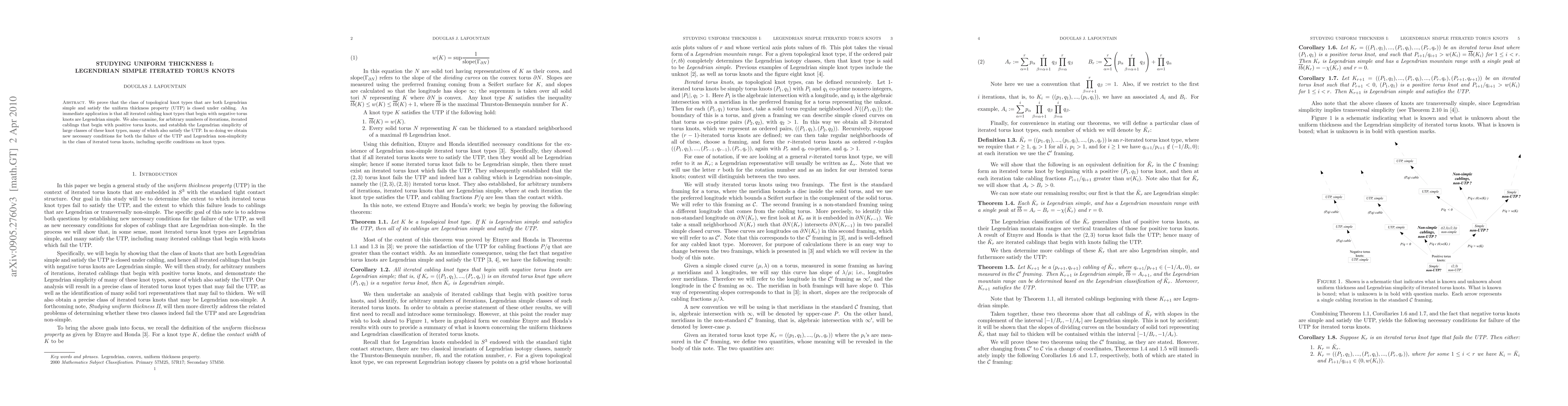 We prove that the class of topological knot types that are both Legendrian simple and satisfy the uniform thickness property (UTP) is closed under cabling. An immediate application is that all iterated cabling knot types that begin with negative torus knots are Legendrian simple. We also examine, for arbitrary numbers of iterations, iterated cablings that begin with positive torus knots, and establish the Legendrian simplicity of large classes of these knot types, many of which also satisfy the UTP. In so doing we obtain new necessary conditions for both the failure of the UTP and Legendrian non-simplicity in the class of iterated torus knots, including specific conditions on knot types.
