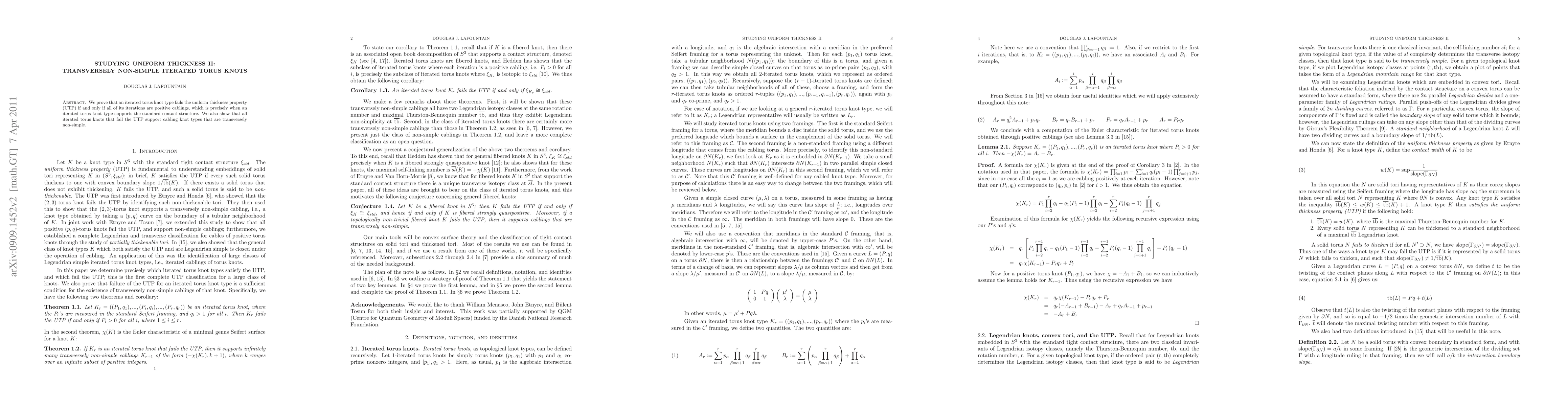 We prove that an iterated torus knot type fails the uniform thickness property (UTP) if and only if all of its iterations are positive cablings, which is precisely when an iterated torus knot type supports the standard contact structure. We also show that all iterated torus knots that fail the UTP support cabling knot types that are transversely non-simple.