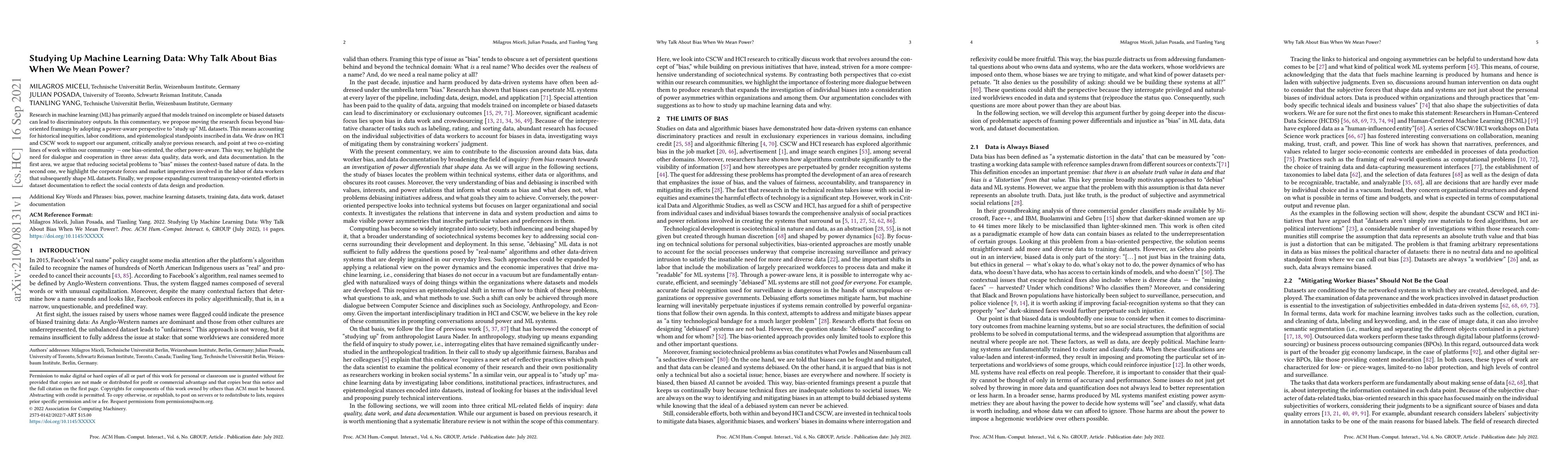 Research in machine learning (ML) has primarily argued that models trained on incomplete or biased datasets can lead to discriminatory outputs. In this commentary, we propose moving the research focus beyond bias-oriented framings by adopting a power-aware perspective to "study up" ML datasets. This means accounting for historical inequities, labor conditions, and epistemological standpoints inscribed in data. We draw on HCI and CSCW work to support our argument, critically analyze previous research, and point at two co-existing lines of work within our community -- one bias-oriented, the other power-aware. This way, we highlight the need for dialogue and cooperation in three areas: data quality, data work, and data documentation. In the first area, we argue that reducing societal problems to "bias" misses the context-based nature of data. In the second one, we highlight the corporate forces and market imperatives involved in the labor of data workers that subsequently shape ML datasets. Finally, we propose expanding current transparency-oriented efforts in dataset documentation to reflect the social contexts of data design and production.
