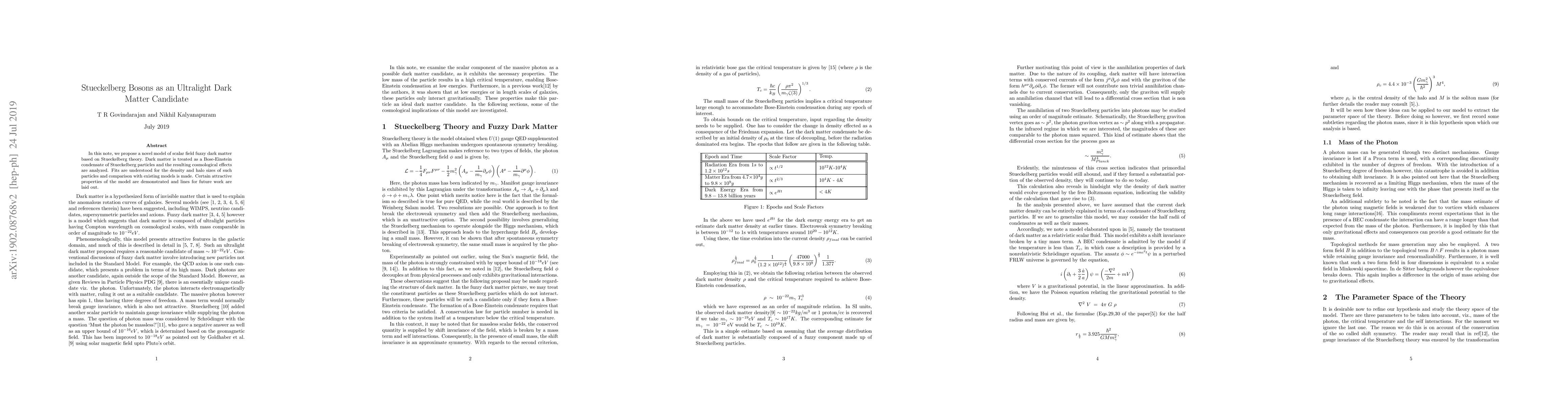 This paper proposes a new ultralight dark matter model based on Stueckelberg bosons forming a Bose-Einstein condensate, analyzing its cosmological effects and fitting density and halo sizes, while comparing it favorably with existing models and outlining future research directions.