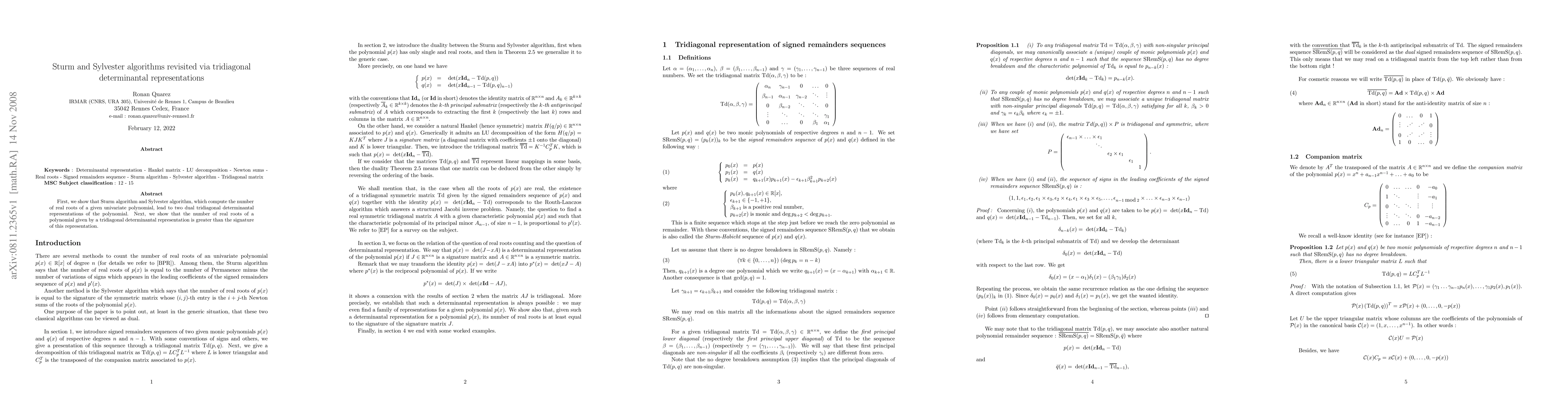 Summary: This paper revisits the Sturm and Sylvester algorithms, demonstrating their connection to dual tridiagonal determinantal representations of polynomials. It concludes that the number of real roots of such polynomials exceeds the signature of their tridiagonal determinantal representation.