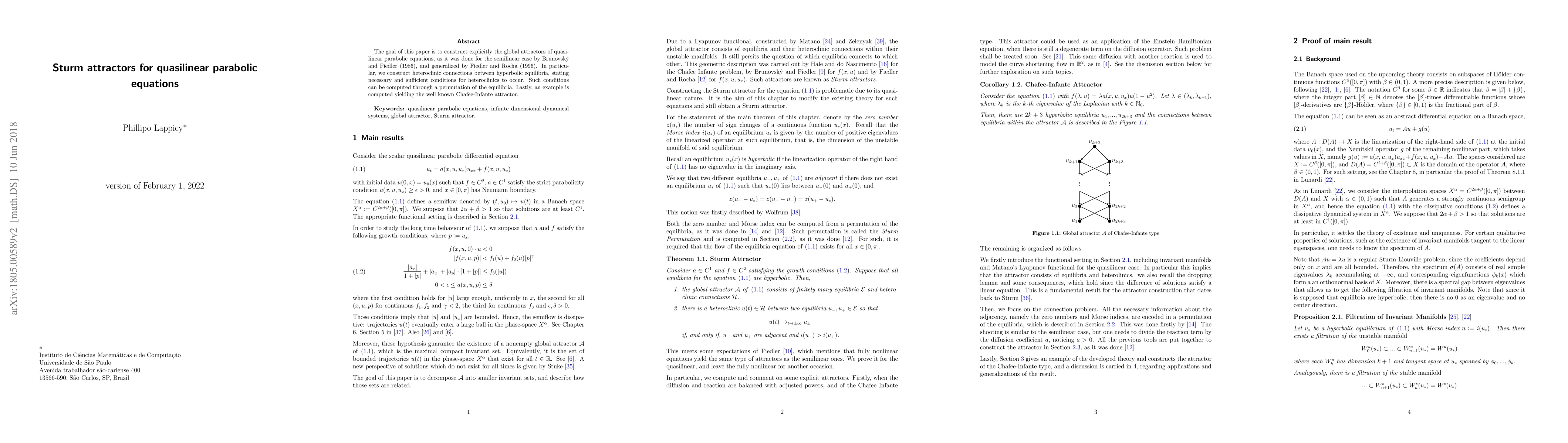 This paper constructs global attractors for quasilinear parabolic equations and establishes heteroclinic connections between hyperbolic equilibria, providing computable conditions for their occurrence. An example demonstrating the Chafee-Infante attractor is also presented.