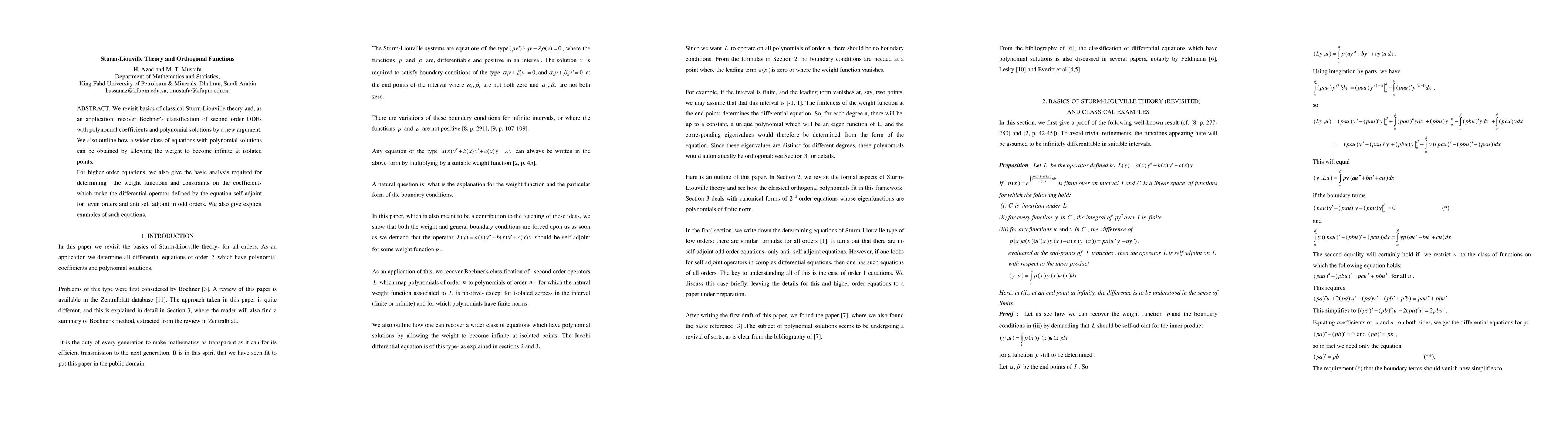 We revisit basics of classical Sturm-Liouville theory and, as an application, recover Bochner's classification of second order ODEs with polynomial coefficients and polynomial solutions by a new argument. We also outline how a wider class of equations with polynomial solutions can be obtained by allowing the weight to become infinite at isolated points:the Jacobi equation, in general, is of this type. For higher order equations, we also give the basic analysis required for determining the weight functions and constraints on the coefficients which make the differential operator defined by the equation self adjoint for even orders and anti self adjoint in odd orders. We also give explicit examples of such equations.
