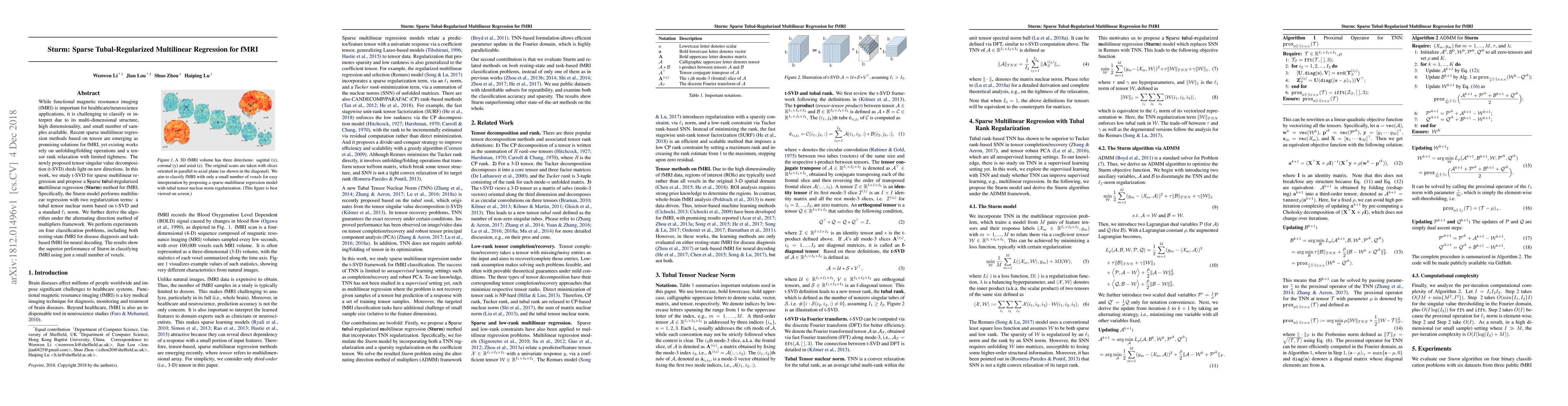 The paper proposes a novel Sparse Tubal-Regularized Multilinear Regression (Sturm) method for fMRI analysis, utilizing tensor singular value decomposition (t-SVD) to enhance classification performance. The method outperforms existing techniques in classifying fMRI data with minimal samples.