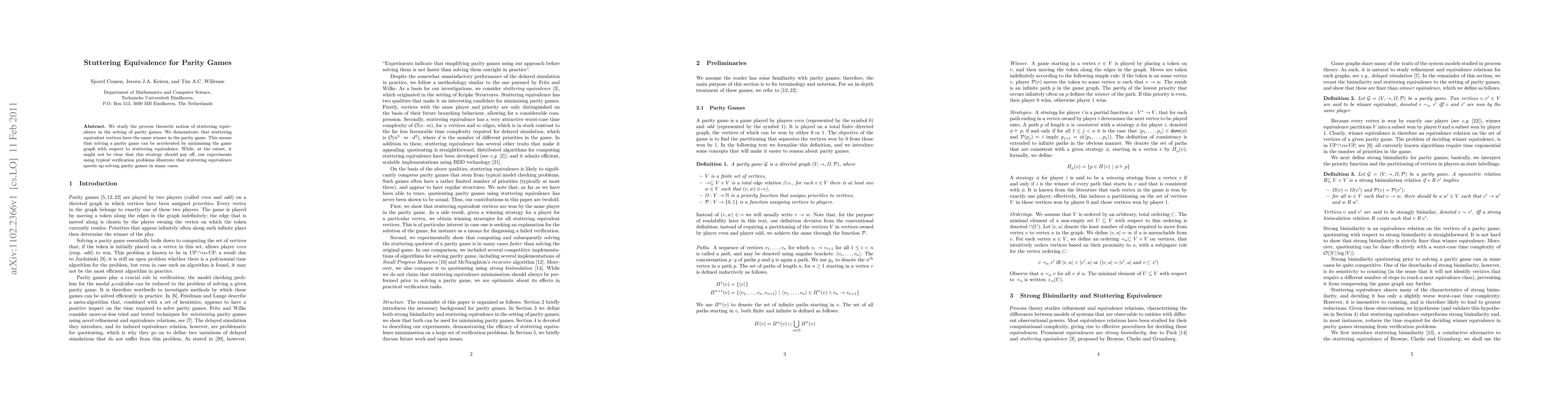 This paper explores stuttering equivalence in parity games, showing that equivalent vertices share the same winning outcome, thus allowing game graph minimization to accelerate solving. Experimental results demonstrate that this approach effectively speeds up the resolution of parity games in many practical scenarios.