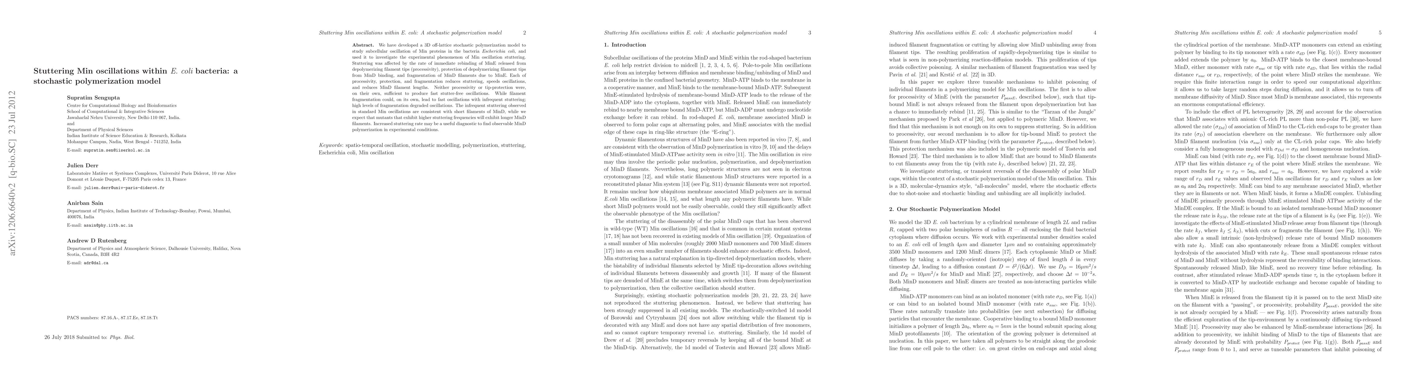 Researchers developed a model to study Min oscillation in E. coli bacteria, finding that stuttering rates decrease with increased processivity, protection of filament tips, and fragmentation of MinD filaments, leading to faster oscillations.