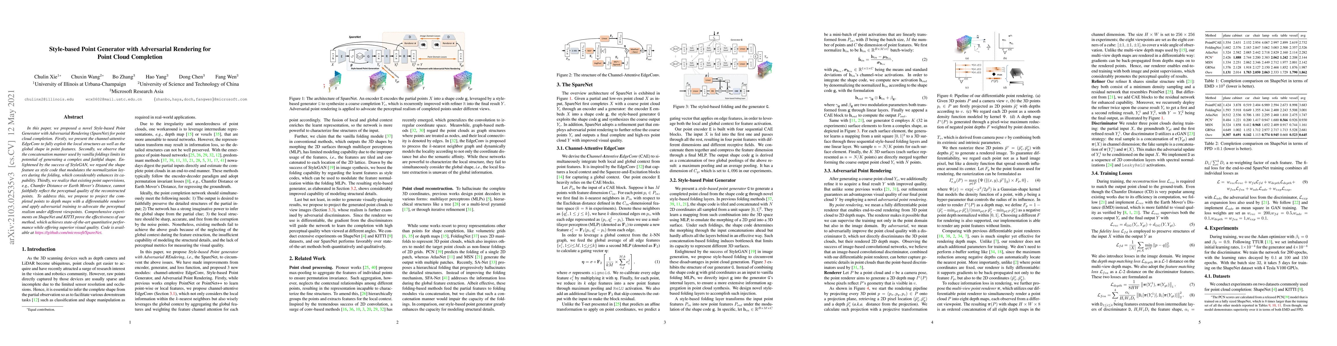 In this paper, we proposed a novel Style-based Point Generator with Adversarial Rendering (SpareNet) for point cloud completion. Firstly, we present the channel-attentive EdgeConv to fully exploit the local structures as well as the global shape in point features. Secondly, we observe that the concatenation manner used by vanilla foldings limits its potential of generating a complex and faithful shape. Enlightened by the success of StyleGAN, we regard the shape feature as style code that modulates the normalization layers during the folding, which considerably enhances its capability. Thirdly, we realize that existing point supervisions, e.g., Chamfer Distance or Earth Mover's Distance, cannot faithfully reflect the perceptual quality of the reconstructed points. To address this, we propose to project the completed points to depth maps with a differentiable renderer and apply adversarial training to advocate the perceptual realism under different viewpoints. Comprehensive experiments on ShapeNet and KITTI prove the effectiveness of our method, which achieves state-of-the-art quantitative performance while offering superior visual quality.