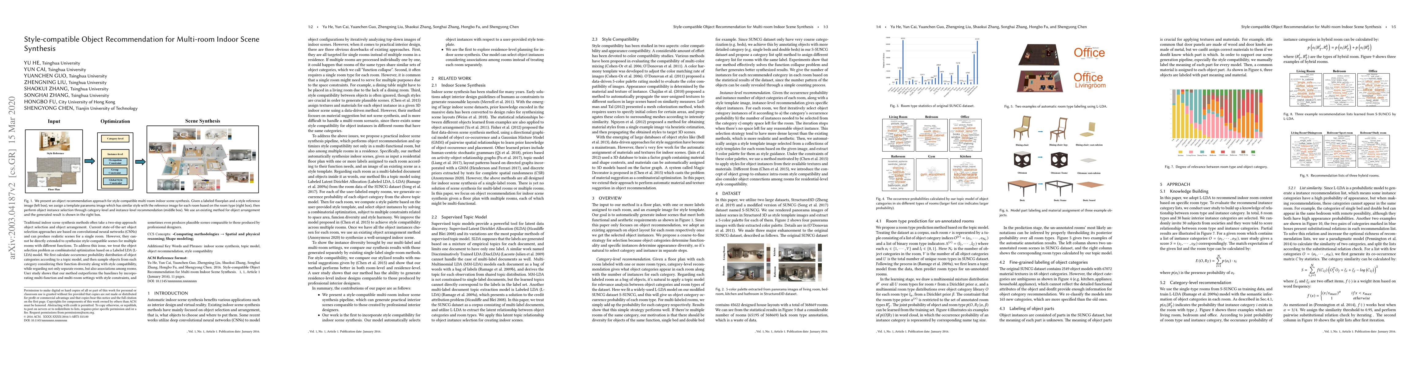 This paper proposes a method for synthesizing style-compatible objects across multiple rooms using a Labeled LDA model for combinatorial optimization. The approach considers object function diversity and inter-room associations, outperforming baselines in user studies by generating realistic multi-room scenes.