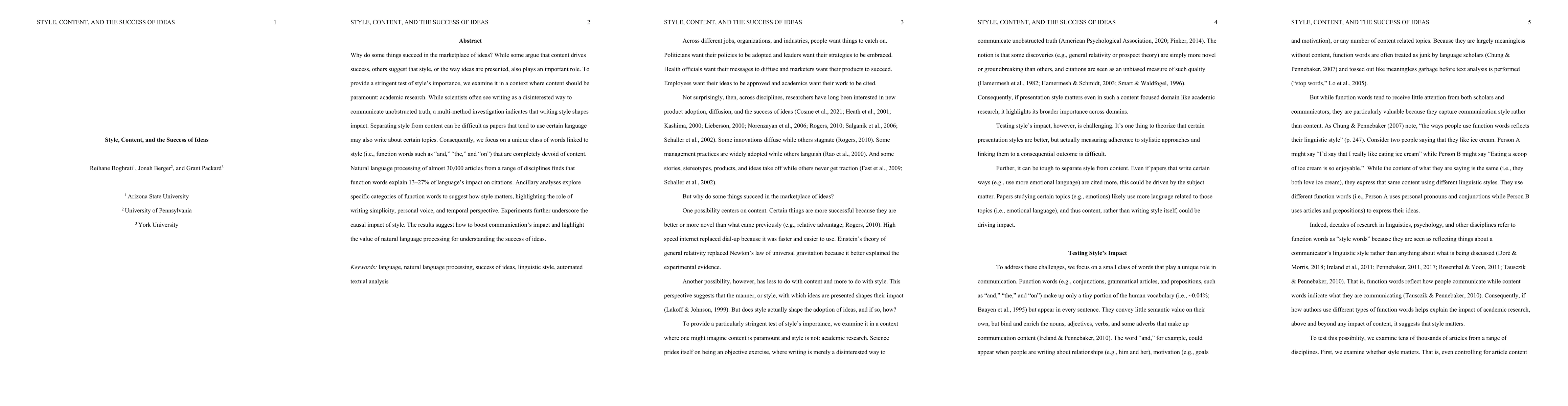 Why do some things succeed in the marketplace of ideas? While some argue that content drives success, others suggest that style, or the way ideas are presented, also plays an important role. To provide a stringent test of style's importance, we examine it in a context where content should be paramount: academic research. While scientists often see writing as a disinterested way to communicate unobstructed truth, a multi-method investigation indicates that writing style shapes impact. Separating style from content can be difficult as papers that tend to use certain language may also write about certain topics. Consequently, we focus on a unique class of words linked to style (i.e., function words such as "and," "the," and "on") that are completely devoid of content. Natural language processing of almost 30,000 articles from a range of disciplines finds that function words explain 13-27% of language's impact on citations. Ancillary analyses explore specific categories of function words to suggest how style matters, highlighting the role of writing simplicity, personal voice, and temporal perspective. Experiments further underscore the causal impact of style. The results suggest how to boost communication's impact and highlight the value of natural language processing for understanding the success of ideas.