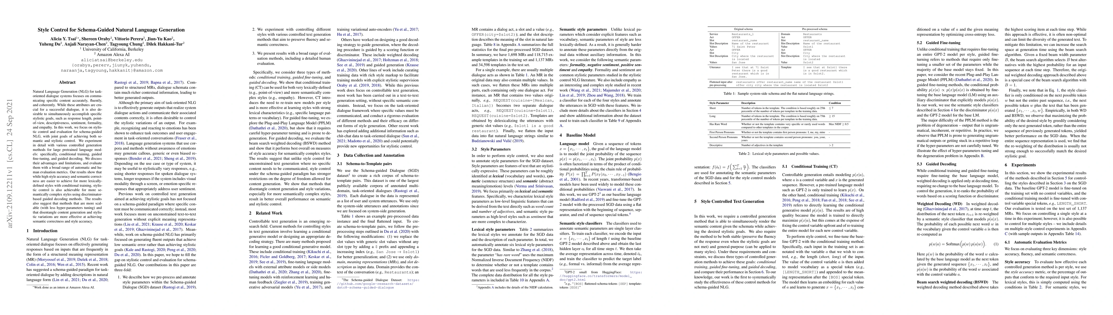 This paper explores methods for achieving stylistic control in schema-guided natural language generation, comparing conditional training, guided fine-tuning, and guided decoding. Results indicate that while conditional training excels in lexically-defined styles, discriminator-based decoding methods are more effective for complex styles.