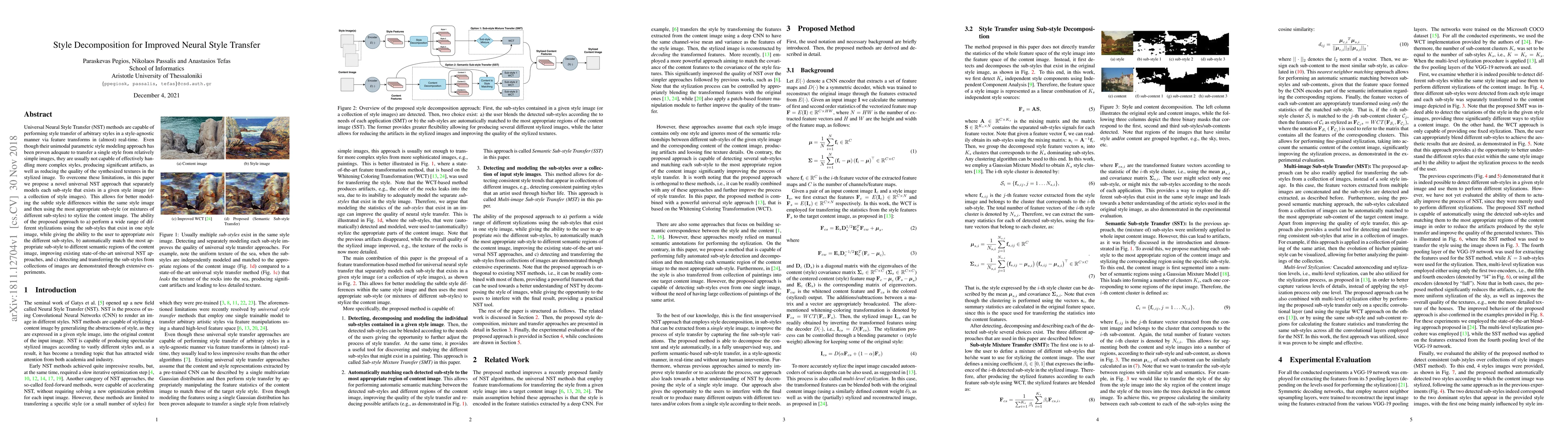 Universal Neural Style Transfer (NST) methods are capable of performing style transfer of arbitrary styles in a style-agnostic manner via feature transforms in (almost) real-time. Even though their unimodal parametric style modeling approach has been proven adequate to transfer a single style from relatively simple images, they are usually not capable of effectively handling more complex styles, producing significant artifacts, as well as reducing the quality of the synthesized textures in the stylized image. To overcome these limitations, in this paper we propose a novel universal NST approach that separately models each sub-style that exists in a given style image (or a collection of style images). This allows for better modeling the subtle style differences within the same style image and then using the most appropriate sub-style (or mixtures of different sub-styles) to stylize the content image. The ability of the proposed approach to a) perform a wide range of different stylizations using the sub-styles that exist in one style image, while giving the ability to the user to appropriate mix the different sub-styles, b) automatically match the most appropriate sub-style to different semantic regions of the content image, improving existing state-of-the-art universal NST approaches, and c) detecting and transferring the sub-styles from collections of images are demonstrated through extensive experiments.