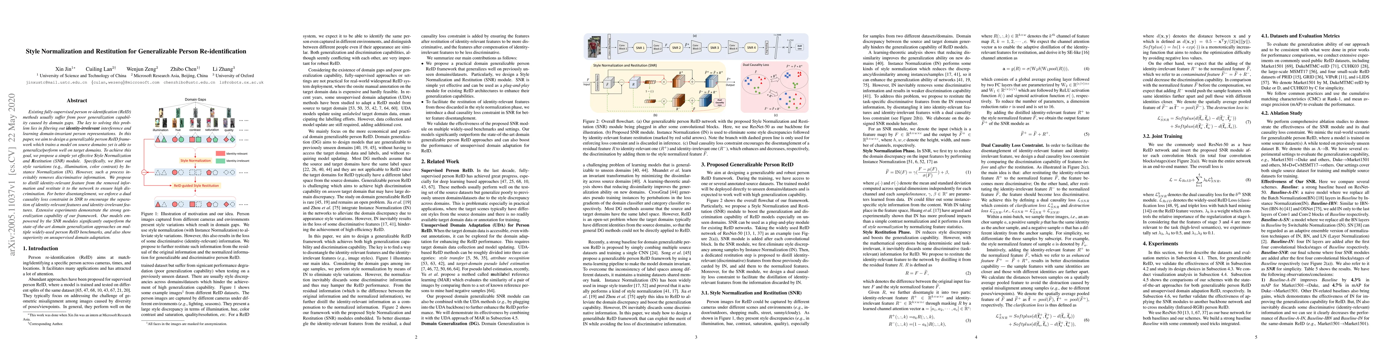 This paper proposes a Style Normalization and Restitution (SNR) module to enhance the generalization of person re-identification models across different domains. The SNR module filters out style variations using Instance Normalization while restituting discriminative features to maintain high discrimination, achieving superior performance on multiple benchmarks.