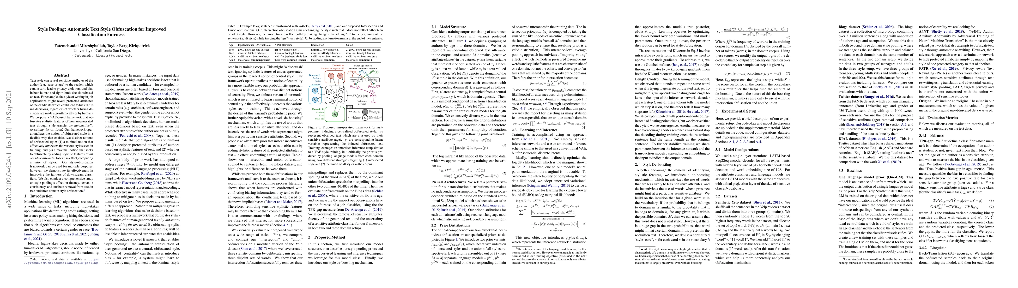 Text style can reveal sensitive attributes of the author (e.g. race or age) to the reader, which can, in turn, lead to privacy violations and bias in both human and algorithmic decisions based on text. For example, the style of writing in job applications might reveal protected attributes of the candidate which could lead to bias in hiring decisions, regardless of whether hiring decisions are made algorithmically or by humans. We propose a VAE-based framework that obfuscates stylistic features of human-generated text through style transfer by automatically re-writing the text itself. Our framework operationalizes the notion of obfuscated style in a flexible way that enables two distinct notions of obfuscated style: (1) a minimal notion that effectively intersects the various styles seen in training, and (2) a maximal notion that seeks to obfuscate by adding stylistic features of all sensitive attributes to text, in effect, computing a union of styles. Our style-obfuscation framework can be used for multiple purposes, however, we demonstrate its effectiveness in improving the fairness of downstream classifiers. We also conduct a comprehensive study on style pooling's effect on fluency, semantic consistency, and attribute removal from text, in two and three domain style obfuscation.