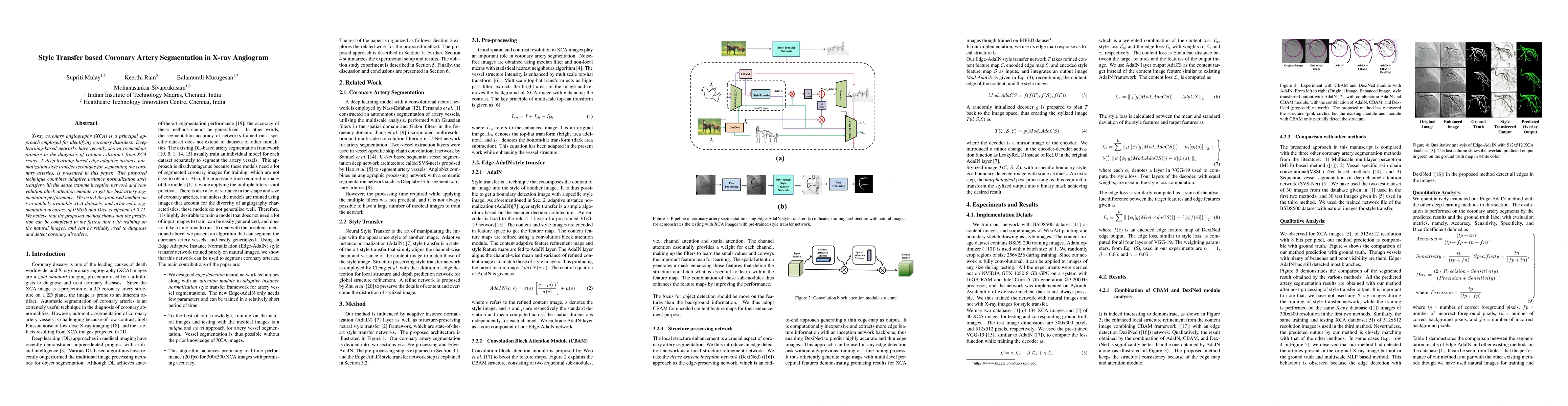 X-ray coronary angiography (XCA) is a principal approach employed for identifying coronary disorders. Deep learning-based networks have recently shown tremendous promise in the diagnosis of coronary disorder from XCA scans. A deep learning-based edge adaptive instance normalization style transfer technique for segmenting the coronary arteries, is presented in this paper. The proposed technique combines adaptive instance normalization style transfer with the dense extreme inception network and convolution block attention module to get the best artery segmentation performance. We tested the proposed method on two publicly available XCA datasets, and achieved a segmentation accuracy of 0.9658 and Dice coefficient of 0.71. We believe that the proposed method shows that the prediction can be completed in the fastest time with training on the natural images, and can be reliably used to diagnose and detect coronary disorders.