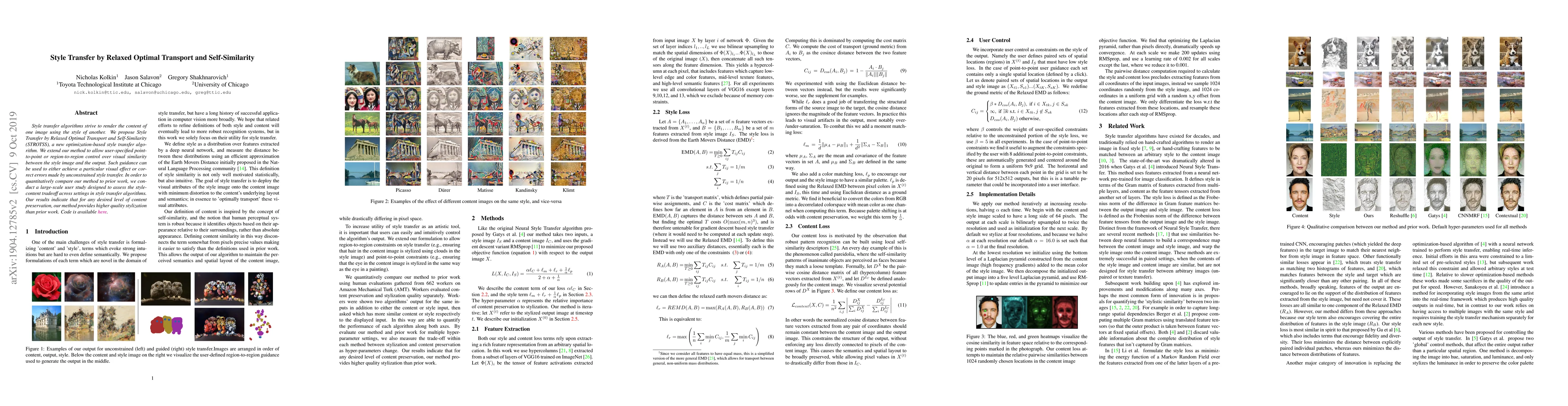 This paper introduces STROTSS, a novel optimization-based style transfer algorithm that leverages relaxed optimal transport and self-similarity for enhanced control over visual similarity. The method allows user-specified adjustments, improving stylization quality and content preservation compared to prior work, as demonstrated through a large-scale user study.