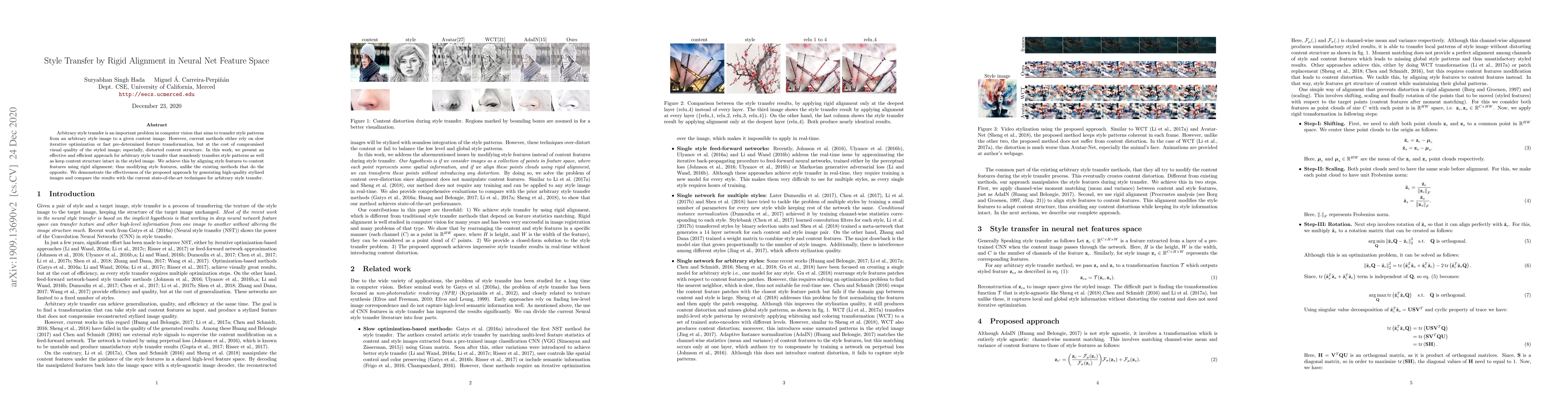 This paper proposes an efficient style transfer method that aligns style features to content features using rigid alignment, thereby preserving content structure while transferring style patterns. The approach generates high-quality stylized images, outperforming existing state-of-the-art techniques.