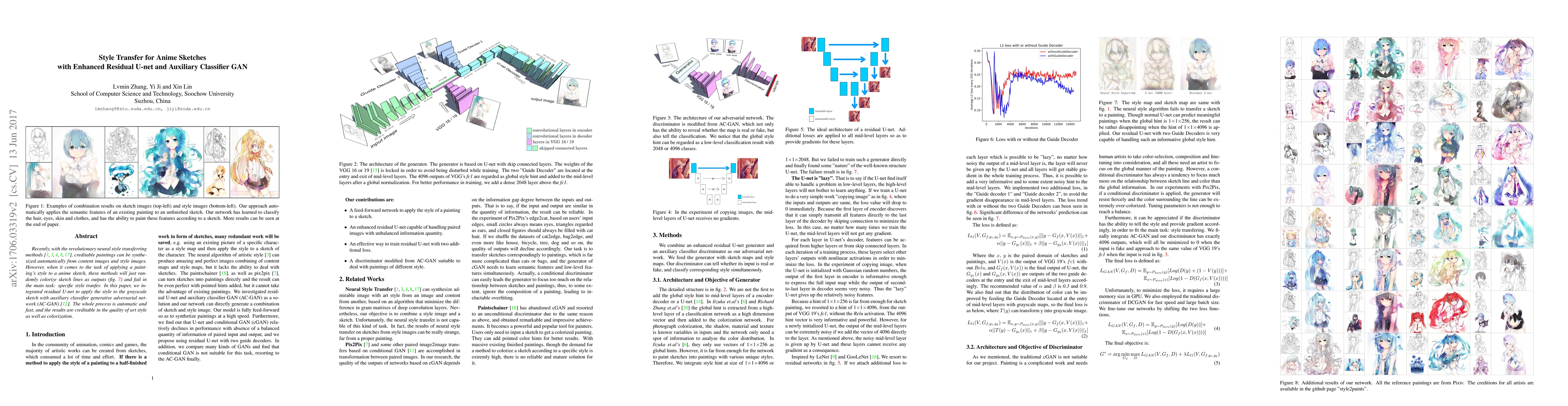 This paper proposes an enhanced residual U-net with an auxiliary classifier GAN for automatic and fast style transfer to anime sketches, achieving high-quality results in both style application and colorization. The method addresses the limitations of existing style transfer techniques for anime sketches.