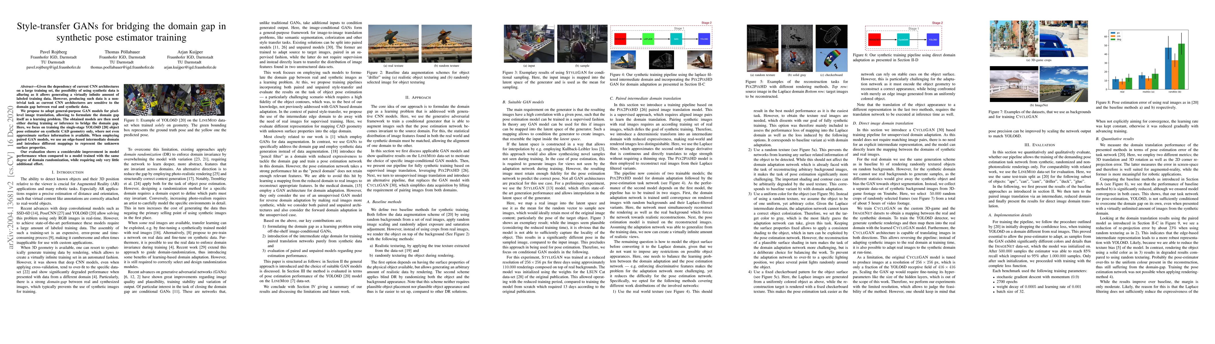 This paper proposes using GAN models to bridge the domain gap in synthetic pose estimator training, improving model performance on CAD geometry with limited surface information.