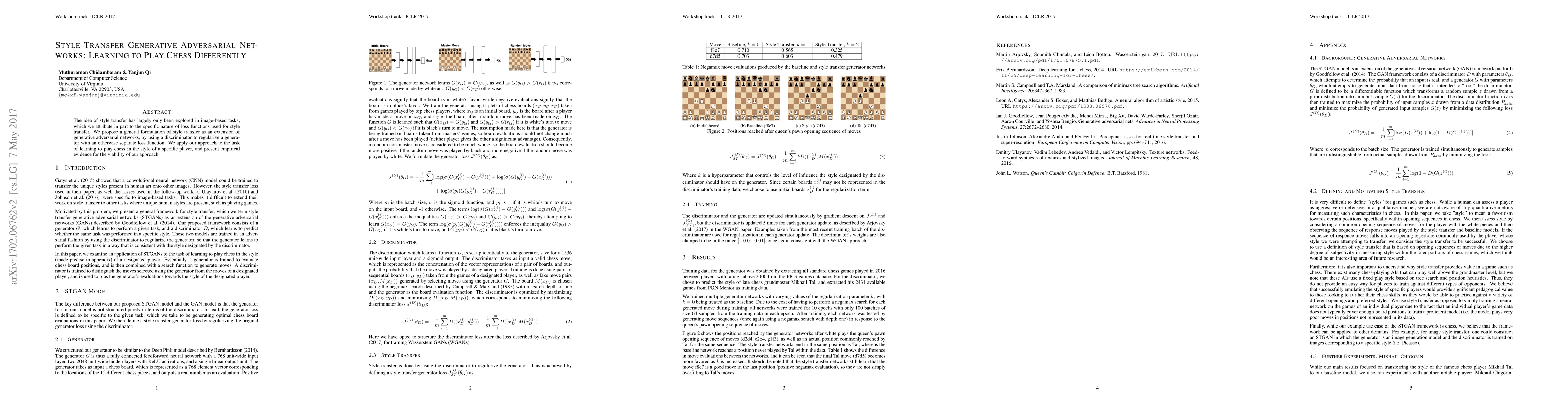 This paper proposes a style transfer method for generative adversarial networks (GANs) to apply to non-image tasks, demonstrating its application to learning chess playing styles. The approach uses a discriminator to regulate a generator with a distinct loss function, showing empirical success in modeling a specific player's chess style.