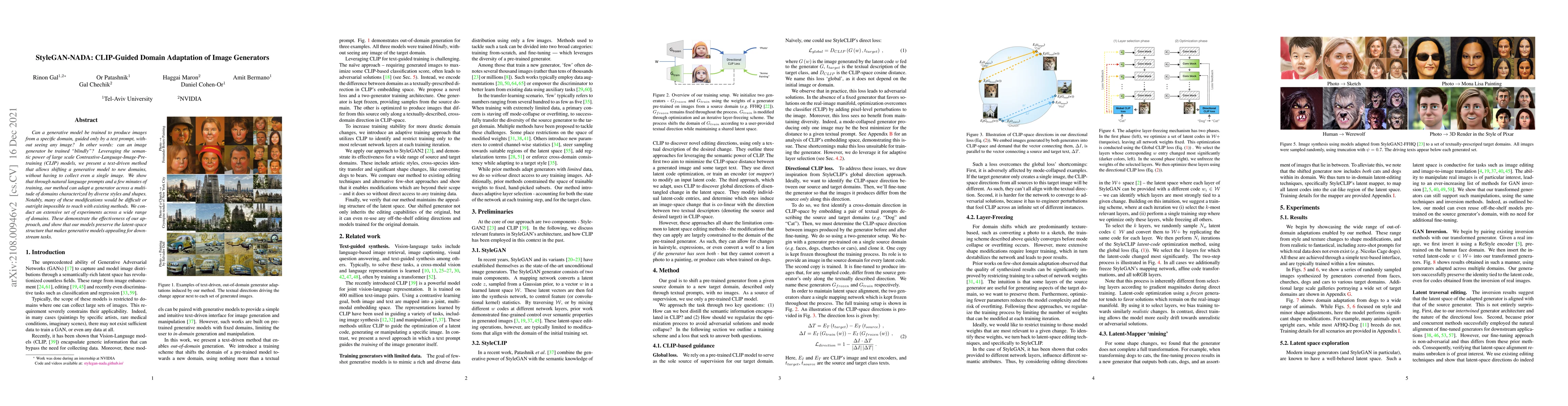 A new method called StyleGAN-NADA enables image generators to produce images from specific domains using only text prompts, without requiring images. This approach adapts models across diverse styles and shapes with minimal training time.