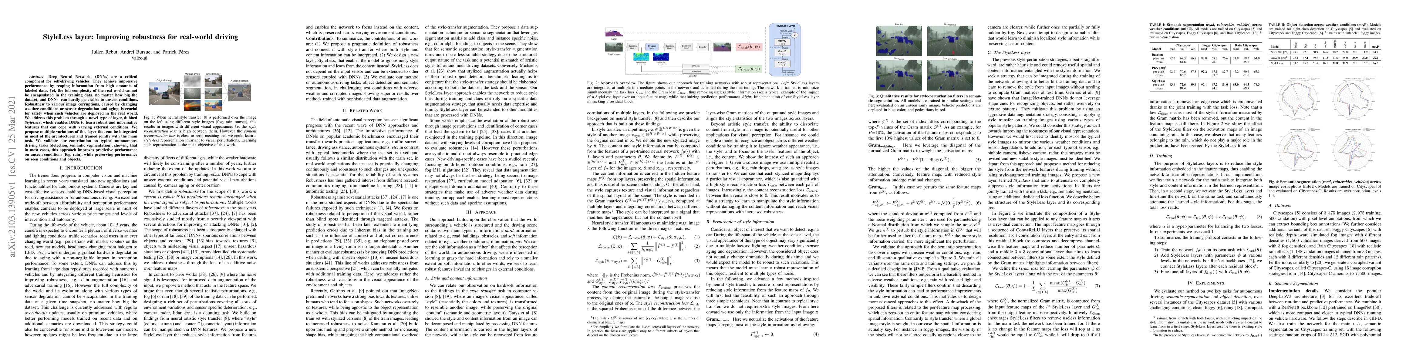 Deep Neural Networks (DNNs) are a critical component for self-driving vehicles. They achieve impressive performance by reaping information from high amounts of labeled data. Yet, the full complexity of the real world cannot be encapsulated in the training data, no matter how big the dataset, and DNNs can hardly generalize to unseen conditions. Robustness to various image corruptions, caused by changing weather conditions or sensor degradation and aging, is crucial for safety when such vehicles are deployed in the real world. We address this problem through a novel type of layer, dubbed StyleLess, which enables DNNs to learn robust and informative features that can cope with varying external conditions. We propose multiple variations of this layer that can be integrated in most of the architectures and trained jointly with the main task. We validate our contribution on typical autonomous-driving tasks (detection, semantic segmentation), showing that in most cases, this approach improves predictive performance on unseen conditions (fog, rain), while preserving performance on seen conditions and objects.