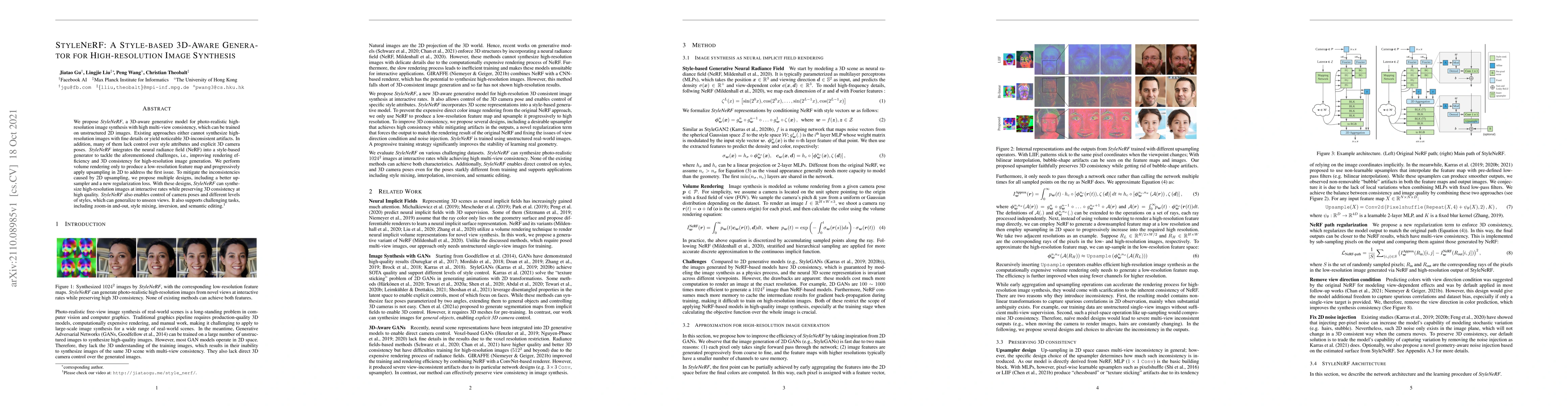 StyleNeRF is a 3D-aware generative model that combines neural radiance fields with a style-based generator for high-resolution, photo-realistic image synthesis with multi-view consistency. It addresses challenges of high-resolution detail and 3D consistency by using volume rendering and progressive 2D upsampling, along with improved upsampling techniques and regularization losses.