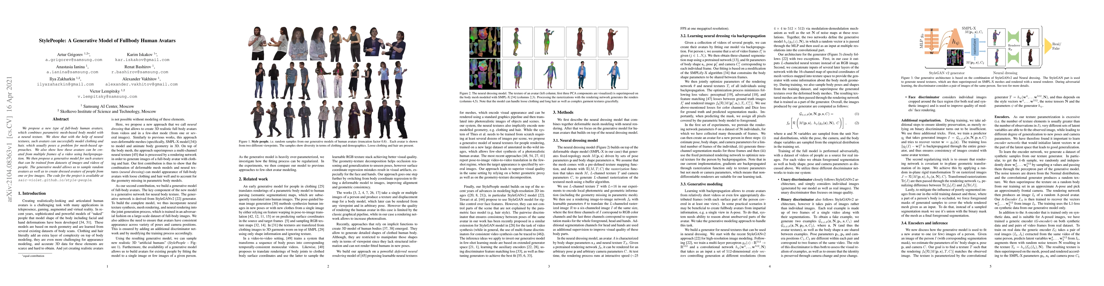 This paper introduces StylePeople, a generative model that combines parametric mesh-based body models with neural textures to create full-body human avatars capable of accurately modeling clothing and hair. The model can be trained on datasets of images and videos, enabling the generation of random avatars and dressed avatars from one or few images.