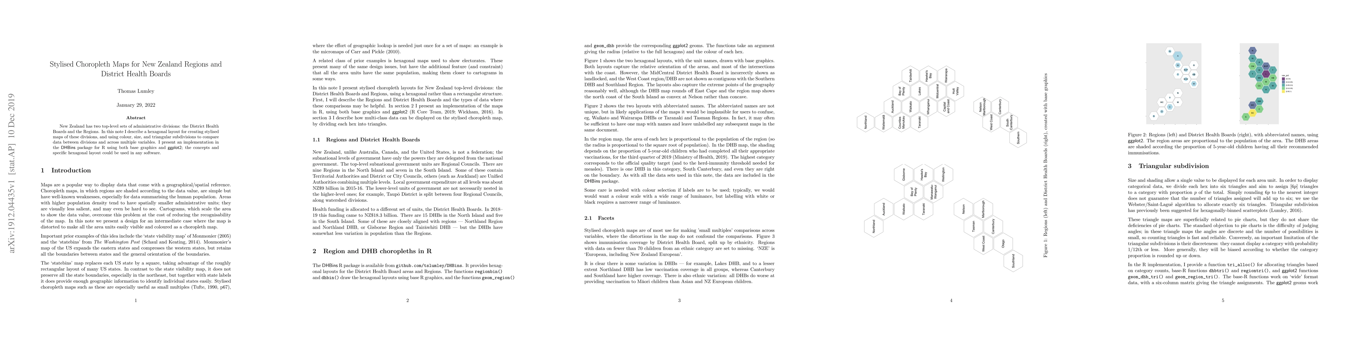 New Zealand has two top-level sets of administrative divisions: the District Health Boards and the Regions. In this note I describe a hexagonal layout for creating stylised maps of these divisions, and using colour, size, and triangular subdivisions to compare data between divisions and across multiple variables. I present an implementation in the DHBins package for R using both base graphics and ggplot2; the concepts and specific hexagonal layout could be used in any software.