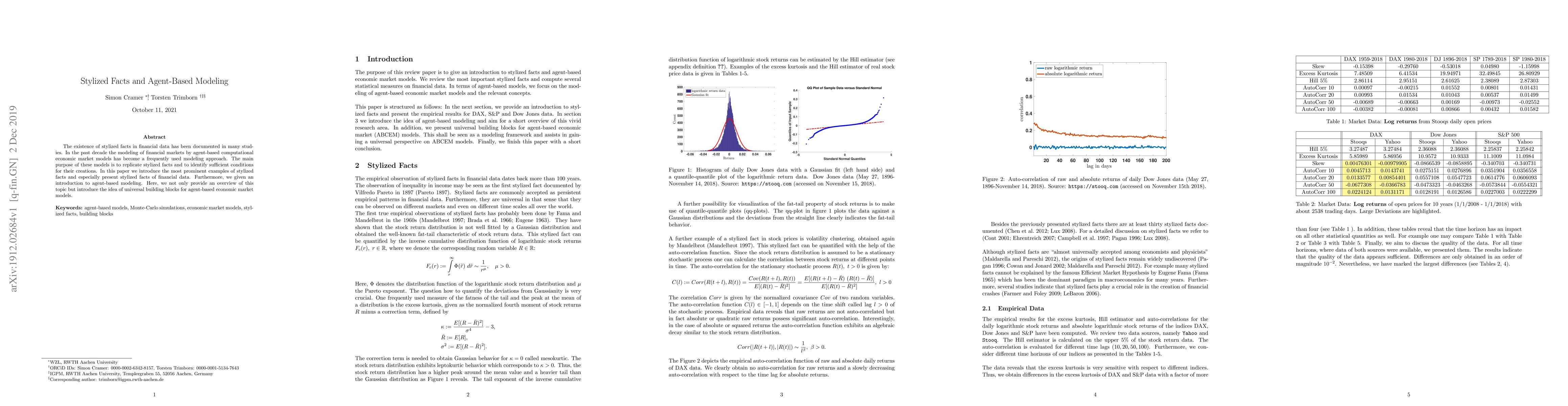 This paper reviews prominent stylized facts in financial data and introduces agent-based modeling as a tool to replicate these facts. It also proposes universal building blocks for constructing agent-based economic market models.