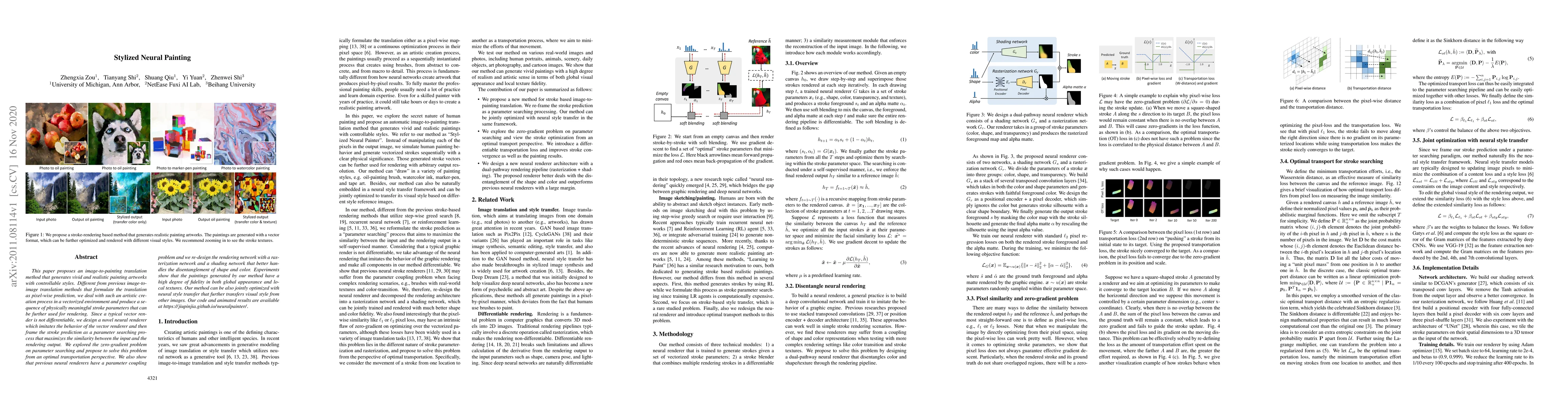 This paper proposes an image-to-painting translation method that generates vivid and realistic painting artworks with controllable styles. Different from previous image-to-image translation methods that formulate the translation as pixel-wise prediction, we deal with such an artistic creation process in a vectorized environment and produce a sequence of physically meaningful stroke parameters that can be further used for rendering. Since a typical vector render is not differentiable, we design a novel neural renderer which imitates the behavior of the vector renderer and then frame the stroke prediction as a parameter searching process that maximizes the similarity between the input and the rendering output. We explored the zero-gradient problem on parameter searching and propose to solve this problem from an optimal transportation perspective. We also show that previous neural renderers have a parameter coupling problem and we re-design the rendering network with a rasterization network and a shading network that better handles the disentanglement of shape and color. Experiments show that the paintings generated by our method have a high degree of fidelity in both global appearance and local textures. Our method can be also jointly optimized with neural style transfer that further transfers visual style from other images. Our code and animated results are available at \url{https://jiupinjia.github.io/neuralpainter/}.
