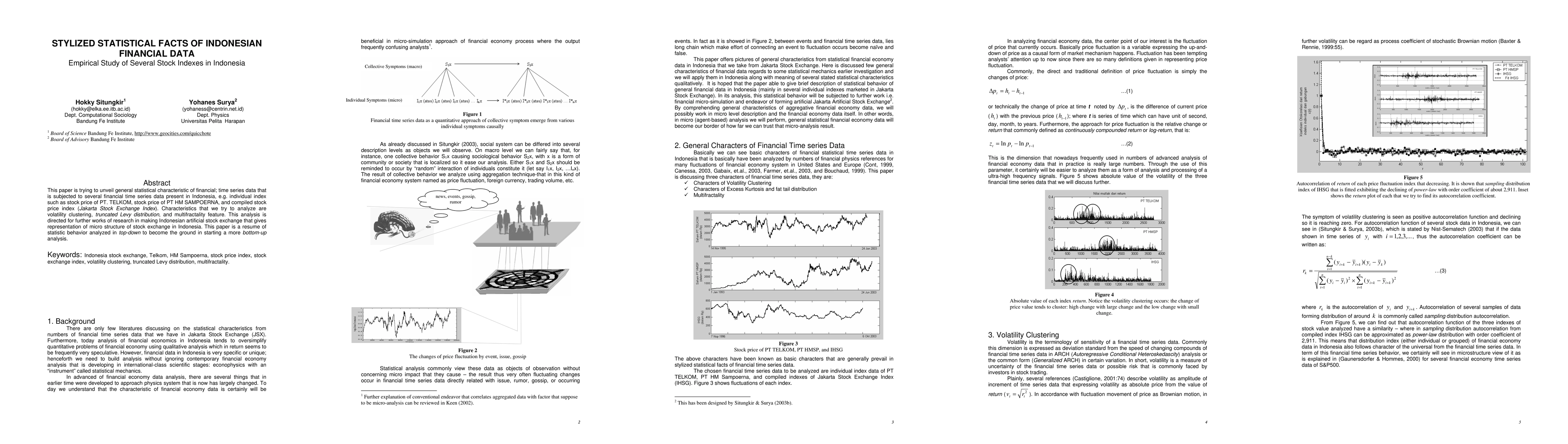 This paper is trying to unveil general statistical characteristic of financial; time series data that is subjected to several financial time series data present in Indonesia, e.g. individual index such as stock price of PT. TELKOM, stock price of PT HM SAMPOERNA, and compiled stock price index (Jakarta Stock Exchange Index). Characteristics that we try to analyze are volatility clustering, truncated Levy distribution, and multifractality feature. This analysis is directed for further works of research in making Indonesian artificial stock exchange that gives representation of micro structure of stock exchange in Indonesia. This paper is a resume of statistic behavior analyzed in top-down to become the ground in starting a more bottom-up analysis.