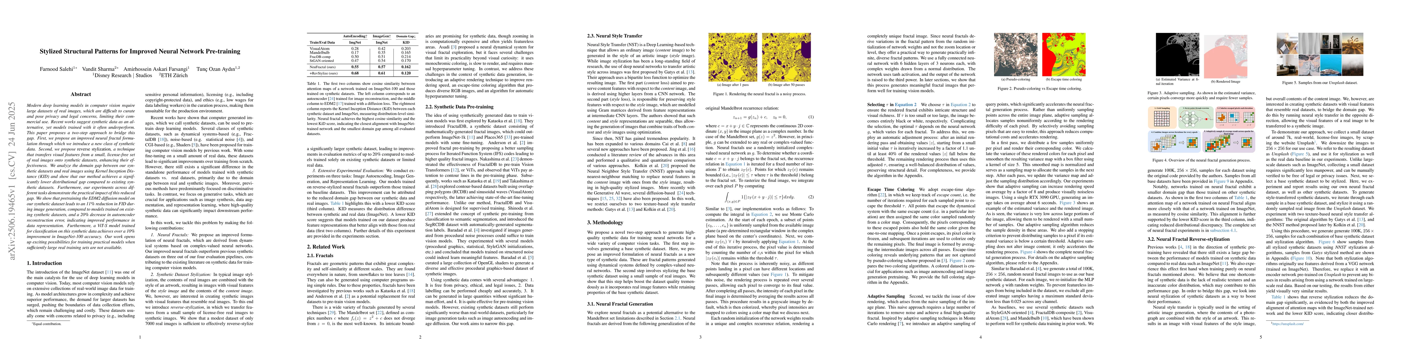 Modern deep learning models in computer vision require large datasets of real images, which are difficult to curate and pose privacy and legal concerns, limiting their commercial use. Recent works suggest synthetic data as an alternative, yet models trained with it often underperform. This paper proposes a two-step approach to bridge this gap. First, we propose an improved neural fractal formulation through which we introduce a new class of synthetic data. Second, we propose reverse stylization, a technique that transfers visual features from a small, license-free set of real images onto synthetic datasets, enhancing their effectiveness. We analyze the domain gap between our synthetic datasets and real images using Kernel Inception Distance (KID) and show that our method achieves a significantly lower distributional gap compared to existing synthetic datasets. Furthermore, our experiments across different tasks demonstrate the practical impact of this reduced gap. We show that pretraining the EDM2 diffusion model on our synthetic dataset leads to an 11% reduction in FID during image generation, compared to models trained on existing synthetic datasets, and a 20% decrease in autoencoder reconstruction error, indicating improved performance in data representation. Furthermore, a ViT-S model trained for classification on this synthetic data achieves over a 10% improvement in ImageNet-100 accuracy. Our work opens up exciting possibilities for training practical models when sufficiently large real training sets are not available.
