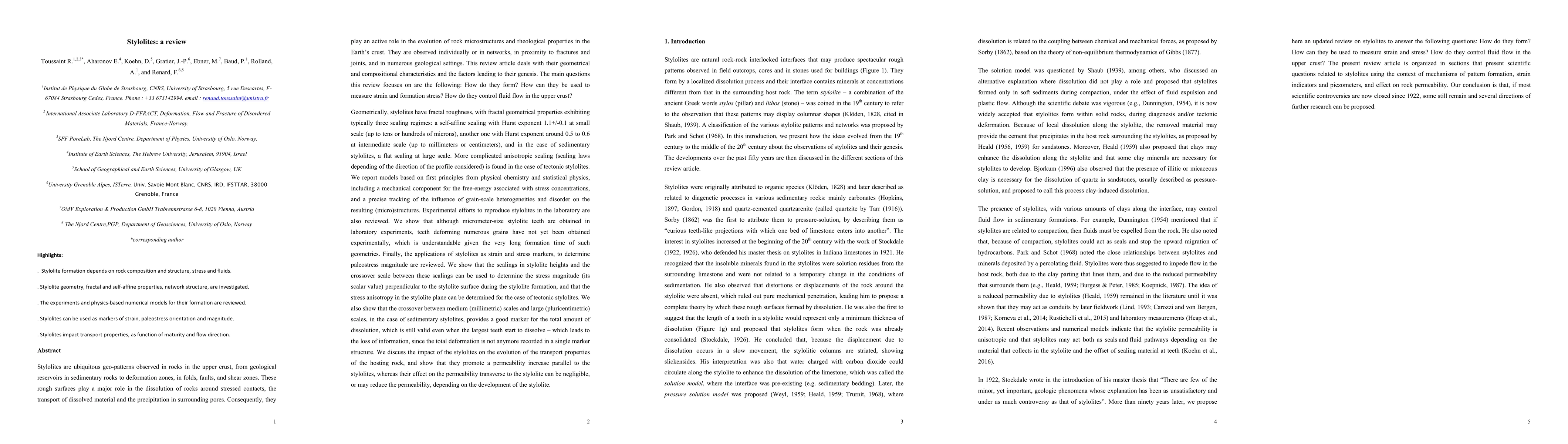 This review explores the formation, geometry, and role of stylolites in rock microstructures, emphasizing their fractal roughness and scaling regimes. It discusses their use as strain and stress markers, and their impact on fluid flow and permeability in the Earth's crust.
