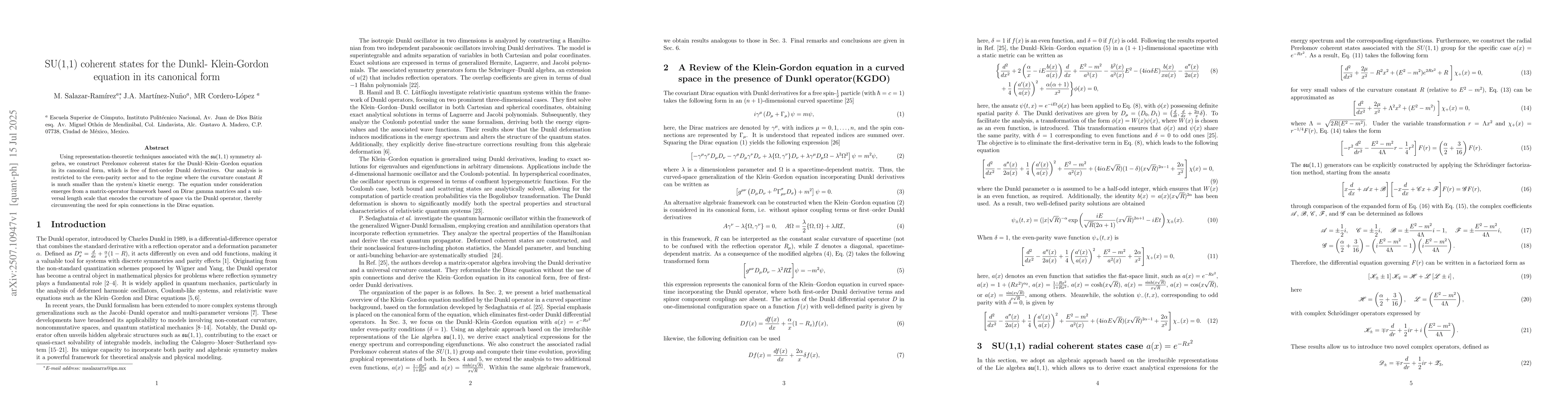 Using representation-theoretic techniques associated with the $\mathfrak{su}(1,1)$ symmetry algebra, we construct Perelomov coherent states for the Dunkl-Klein-Gordon equation in its canonical form, which is free of first-order Dunkl derivatives. Our analysis is restricted to the even-parity sector and to the regime where the curvature constant $R$ is much smaller than the system's kinetic energy. The equation under consideration emerges from a matrix-operator framework based on Dirac gamma matrices and a universal length scale that encodes the curvature of space via the Dunkl operator, thereby circumventing the need for spin connections in the Dirac equation.