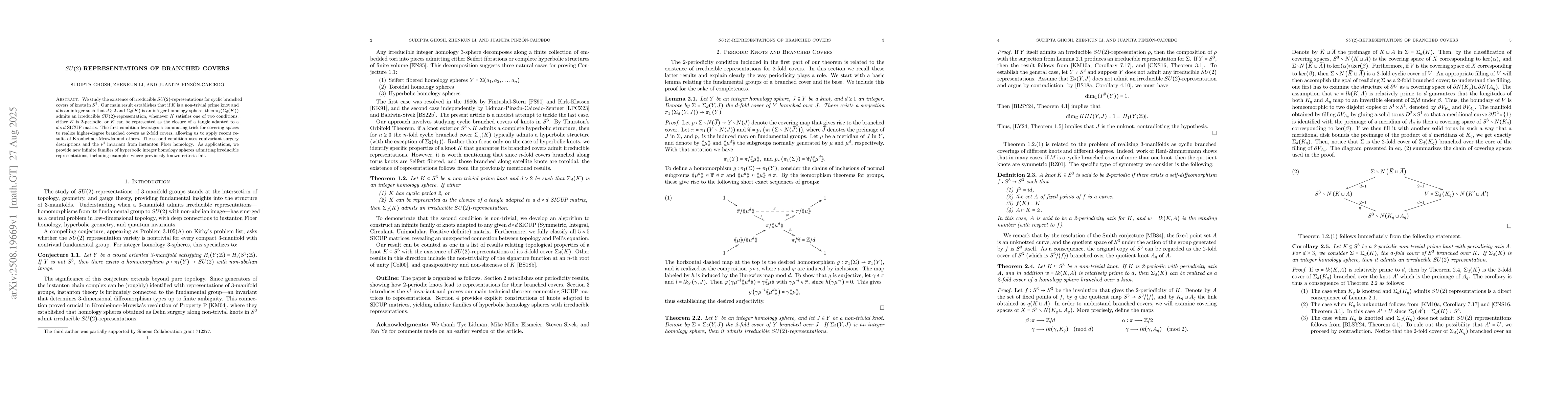 We study the existence of irreducible $SU(2)$-representations for cyclic branched covers of knots in $S^3$. Our main result establishes that if $K$ is a non-trivial prime knot and $d$ is an integer such that $d \geq 2$ and $\Sigma_d(K)$ is an integer homology sphere, then $\pi_1(\Sigma_d(K))$ admits an irreducible $SU(2)$-representation, whenever $K$ satisfies one of two conditions: either $K$ is $2$-periodic, or $K$ can be represented as the closure of a tangle adapted to a $d\times d$ SICUP matrix. The first condition leverages a commuting trick for covering spaces to realize higher-degree branched covers as 2-fold covers, allowing us to apply recent results of Kronheimer-Mrowka and others. The second condition uses equivariant surgery descriptions and the $\nu^\sharp$ invariant from instanton Floer homology. As applications, we provide new infinite families of hyperbolic integer homology spheres admitting irreducible representations, including examples where previously known criteria fail.