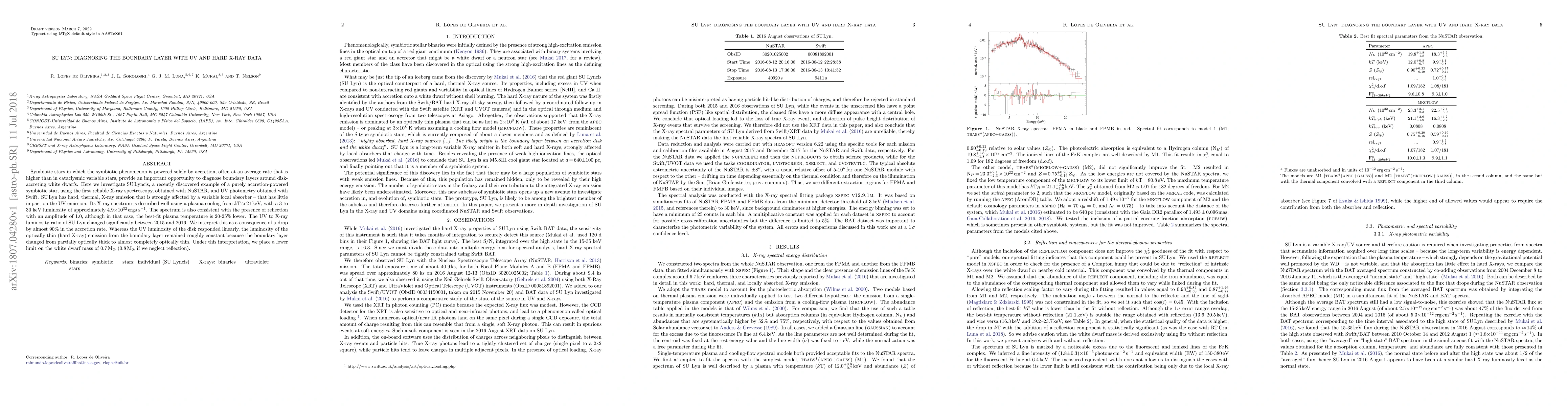 This paper investigates SU Lyncis, a symbiotic star powered by accretion, using NuSTAR X-ray and Swift UV data to diagnose its boundary layer. The X-ray spectrum indicates plasma cooling from 21 keV, with significant changes in UV to X-ray luminosity ratio suggesting a nearly 90% drop in accretion rate, affecting the boundary layer's optical thickness.