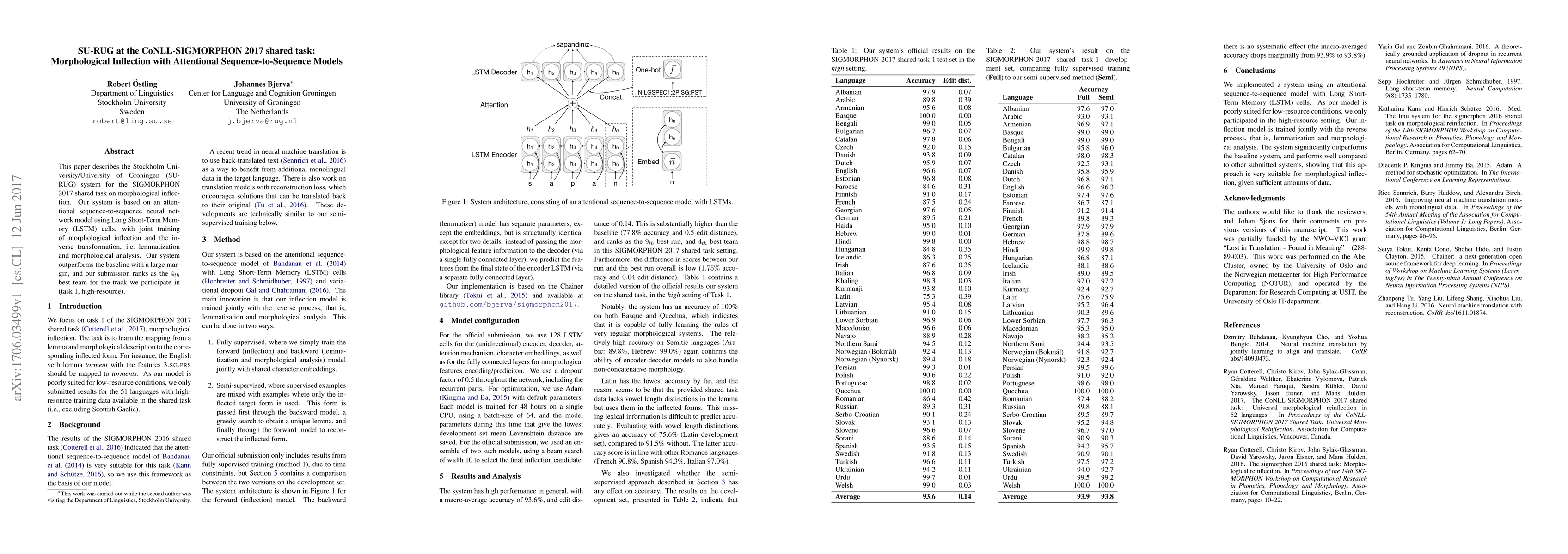 This paper presents the SU-RUG team's system for the 2017 SIGMORPHON shared task on morphological inflection, utilizing an attentional sequence-to-sequence model with LSTM cells. The system achieves superior performance, ranking 4th and significantly outperforming the baseline.