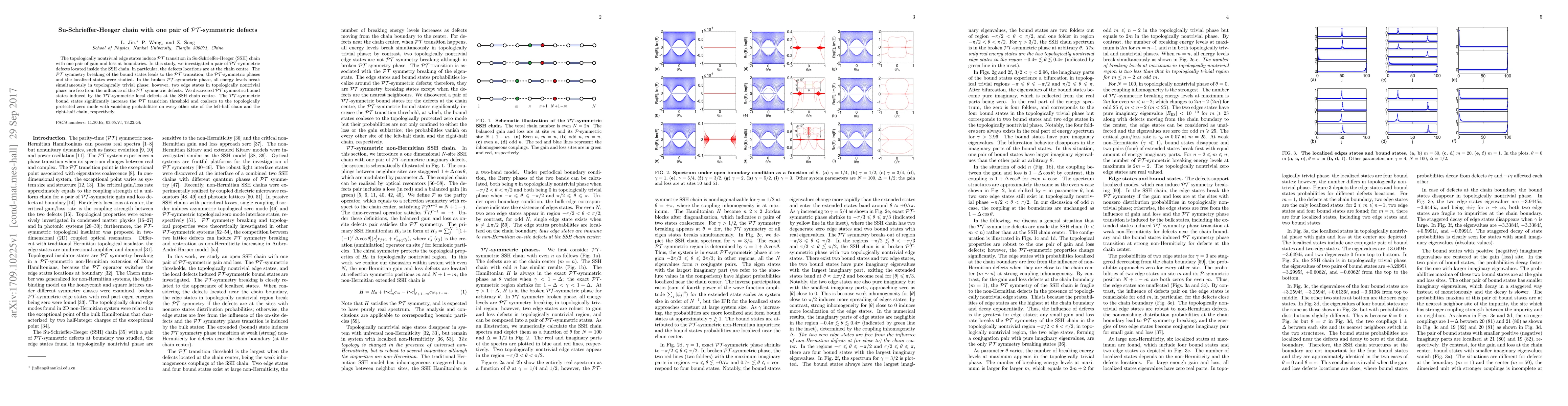 This paper investigates a Su-Schrieffer-Heeger (SSH) chain with PT-symmetric defects at the center, revealing topologically protected edge states unaffected by PT symmetry breaking. The study finds PT-symmetric bound states that enhance the PT transition threshold and form topologically protected zero modes.
